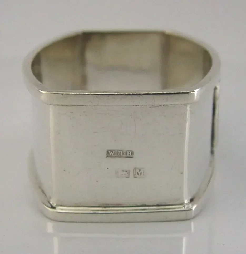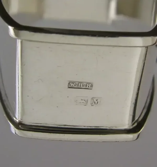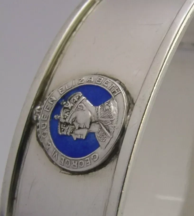An interesting solid sterling silver and enamel Royal souvenir napkin ring. It is hallmarked for Birmingham 1936 with the maker being W H Haseler Ltd who made pieces for Liberty and Co around this time. It has been made as a souvenir of the coronation of King George VI. It is in superb condition being free from dings splits and repairs. It measures approx. 2.25 inches (5.8cm) long by 1.5 inches (4cm) wide by over 0.75 inch (2.2cm) tall and weighs 26 grams. A superb example.