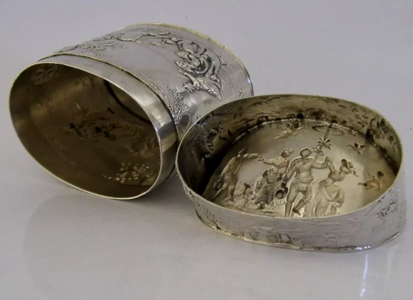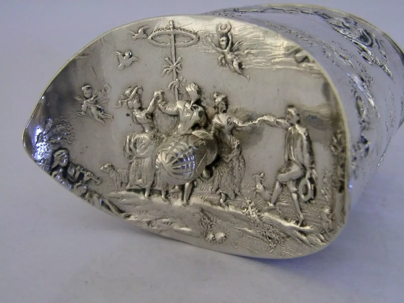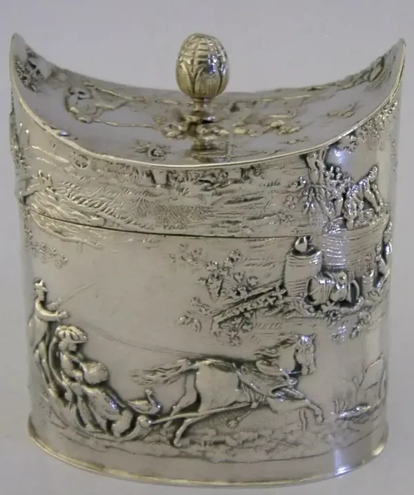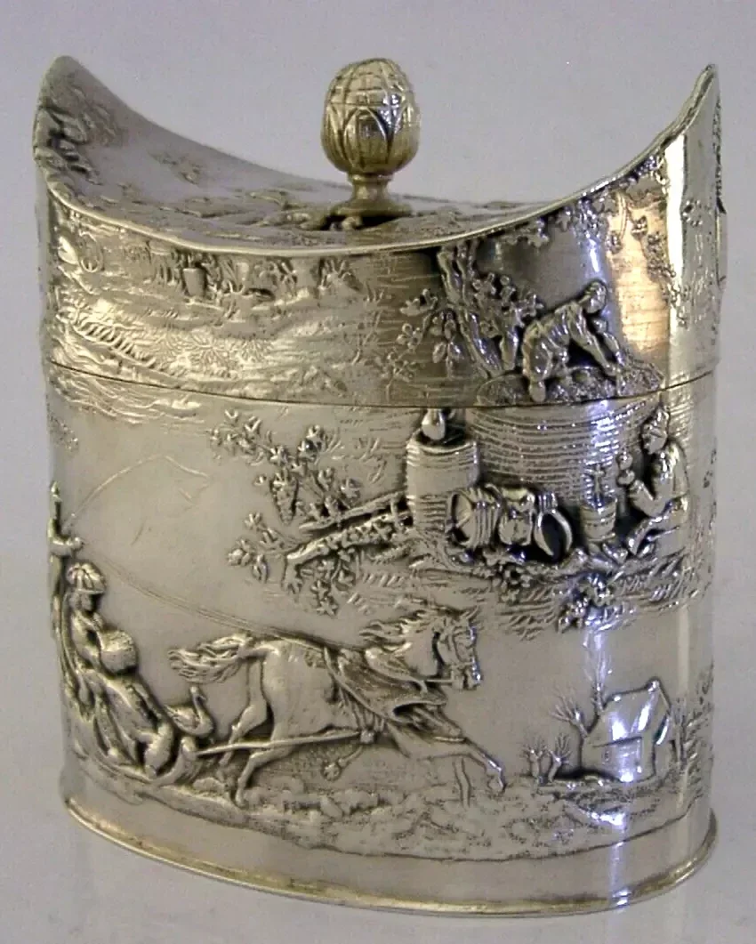 A beautiful rare German Hanau solid silver tea caddy canister box. It is hallmarked with German Hanau marks and dates to c1890-1900. It tests as high grade silver. It has been superbly made being embossed with 19th century scenes of a horse draw sled similar to that found on Russian pieces. It is in super condition being free from dings splits holes and repairs, the inside is clean. It measures approx. 3 inches (7.6cm) across by 1.75 inches (4.6cm) wide by 3.25 inches (8.2cm) tall and weighs 132 grams. A very pretty piece.