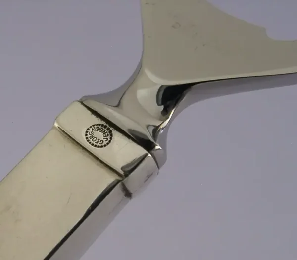 A rare Danish solid sterling silver handled bottle opener. It has been hallmarked STERLING DENMARK along with the makers mark of Georg Jensen. It would date it to c1960s-80's?, the Jensen mark was used 1945 - present. It has been stylishly made in the Pyramid Pattern and has been engraved RDAF for Royal Danish Air Force along with 'SOC JYLL'. It is in super condition being free from dings splits and repairs. It measures approx. 6.5 inches (16.3cm) long by 1.5 inches (3.8cm) wide and weighs 70 grams. A very stylish rare piece.