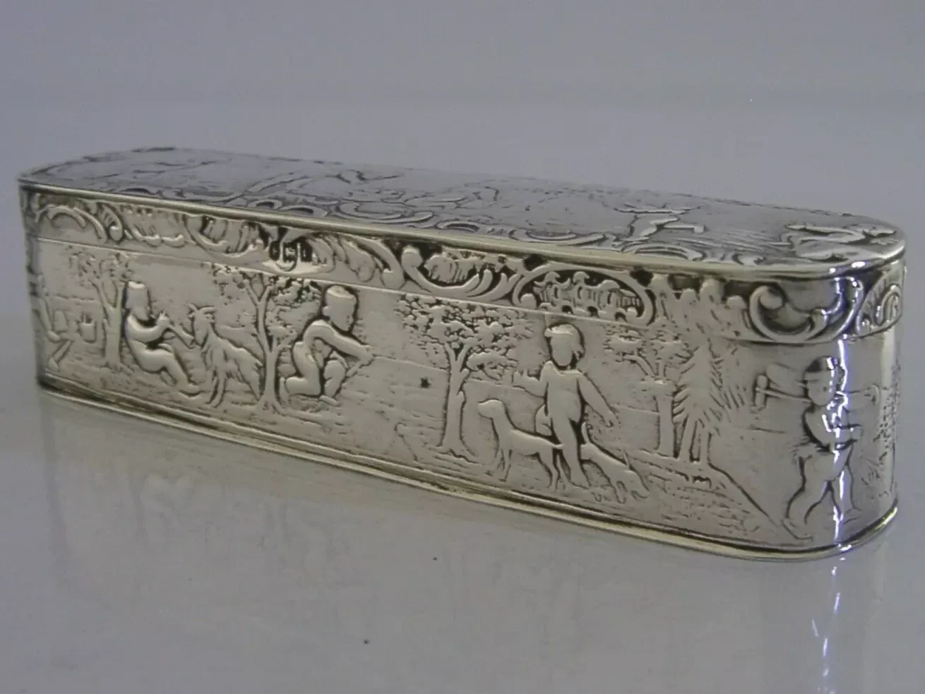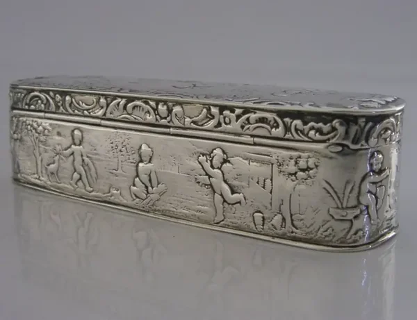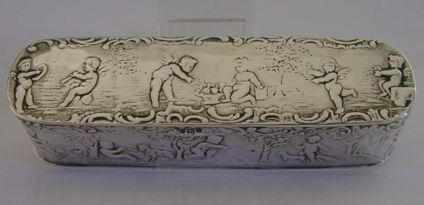A beautiful good sized English antique import solid sterling silver table snuff or trinket box. It is hallmarked with the London import mark for 1901 with the makers mark being that of John George Piddington. It has been superbly made being embossed with a cherub design unusually the interior is as detailed as the exterior. It is in super condition being free from dings splits holes and repairs, the inside is clean and the lid closes tightly. It measures approx. 4.5 inches (11.3cm) across by 1.25 inches (3.2cm) wide by 1.25 inches (3.2cm) tall and weighs 88 grams. A very pretty piece.