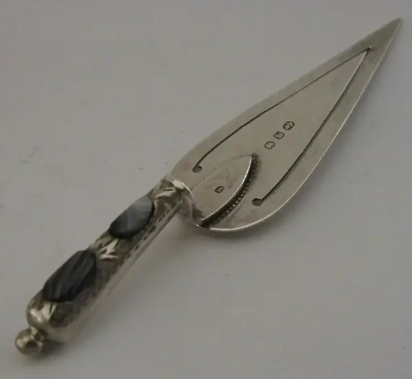 ANTIQUE ENGLISH STERLING SILVER AGATE TROWEL BOOKMARK PAGE MARKER 1896
