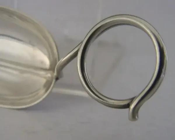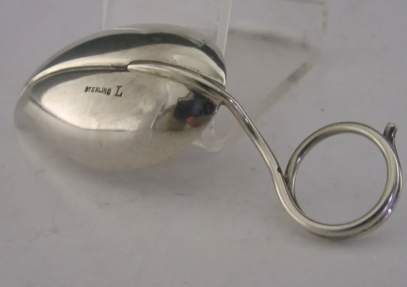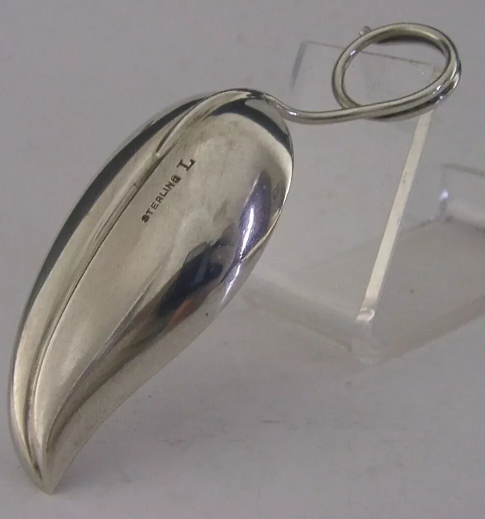 A superb solid sterling silver caddy spoon. It is marked STERLING possibly American, I would date it to c1940. It has been superbly designed with the bowl being in the form of a leaf and a looped stem terminal. It is in super condition being free from dings splits distortions and repairs. It measures approx. 3.5 inches (8.8cm) long by 1.25 inches (3.2cm) wide and weighs 22 grams. A beautifully made example.