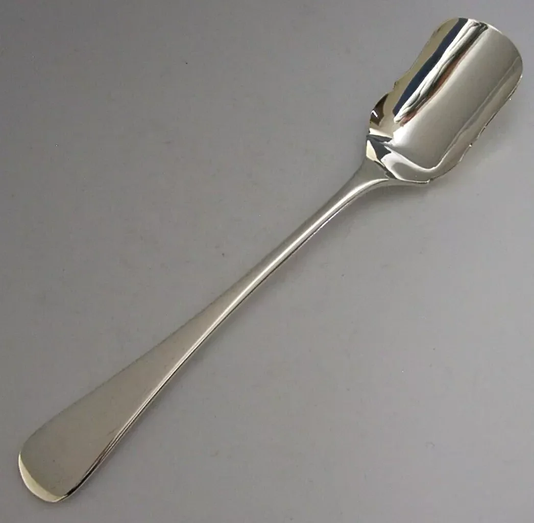 A superb quality English solid sterling silver soft cheese or Stilton scoop. It is hallmarked for Sheffield 2003 with the makers mark being JO. It has been superbly designed being made to what is termed Old English pattern. It is in super condition having no dings splits distortions or repairs, faint marks from use. It measures approx. 8.25 inches (20.6cm) long by 1.5 inches (3.6cm) wide and weighs 84 grams. A very high quality piece.