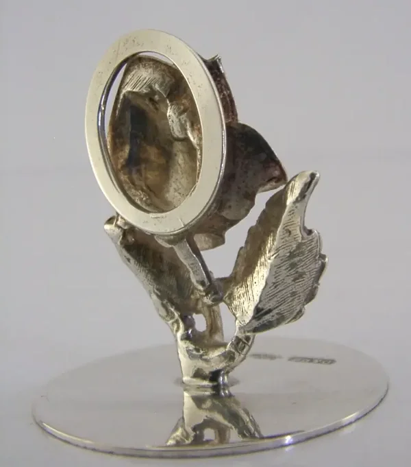 A beautiful sterling silver menu holder. It is hallmarked for Birmingham 2000 with the maker’s marks being D&PB. It has been beautifully designed being cast in the form of a rose. It is in superb condition being free from dings splits and repairs. It measures approx. 1.25 inches (3.5cm) across the base by 1.5 inches (3.6cms) tall and weighs 16 grams. A superb example.