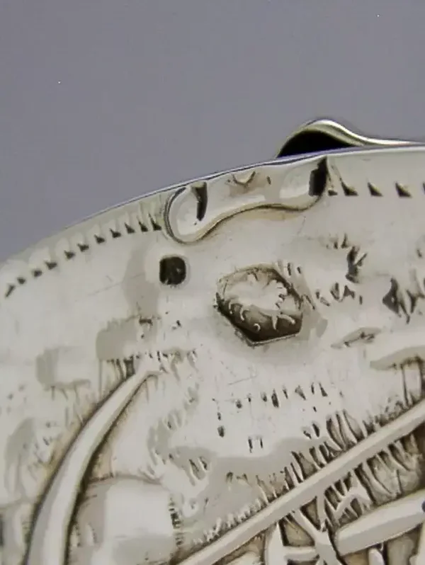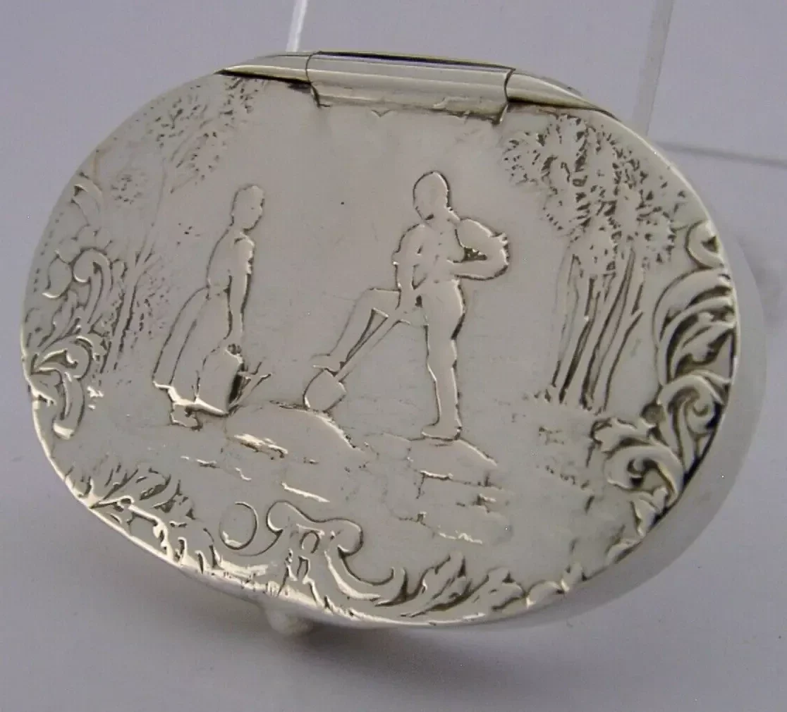 A beautiful Dutch antique solid silver box. It is hallmarked with the Dutch 833 standard Lion passant mark with the date letter being rubbed but I would date it by its design to c1900. One side depicts gardening the other ploughing. It has been beautifully made and is in super condition being free from dings splits holes and repairs, tiny old micro splits to the edge of the hinge but this has no affect - see photo. The inside is perfectly clean and gilded with the lid closing tightly. It measures approx. 2.25 inches (5.8cm) across by 1.5 inches (3.8cm) wide by over 0.25 inch (1cm) deep and weighs 18 grams. A beautifully made piece.