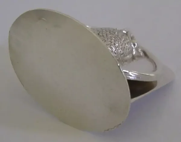 A superbly modelled good sized solid sterling silver place card or menu holder. It is hallmarked for Birmingham 1987 with the makers mark being WH. It has been superbly designed made and is in superb condition being free from dings splits and repairs. It measures approx. 1.75 inches (4cm) across the base by 1.75 inches (4.4cm) tall and weighs 42 grams. A very well made piece.