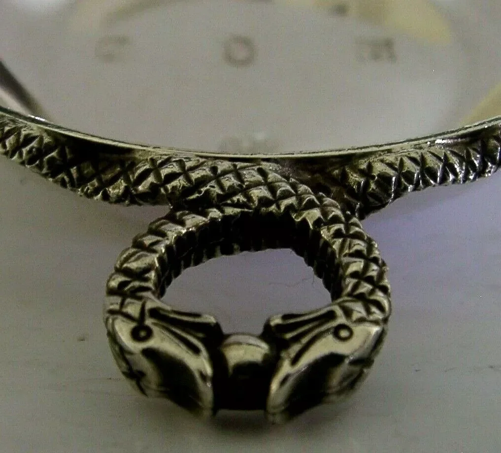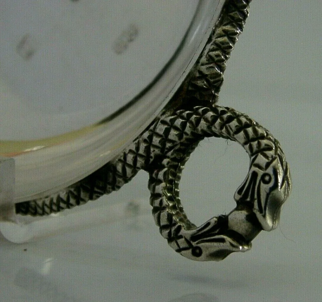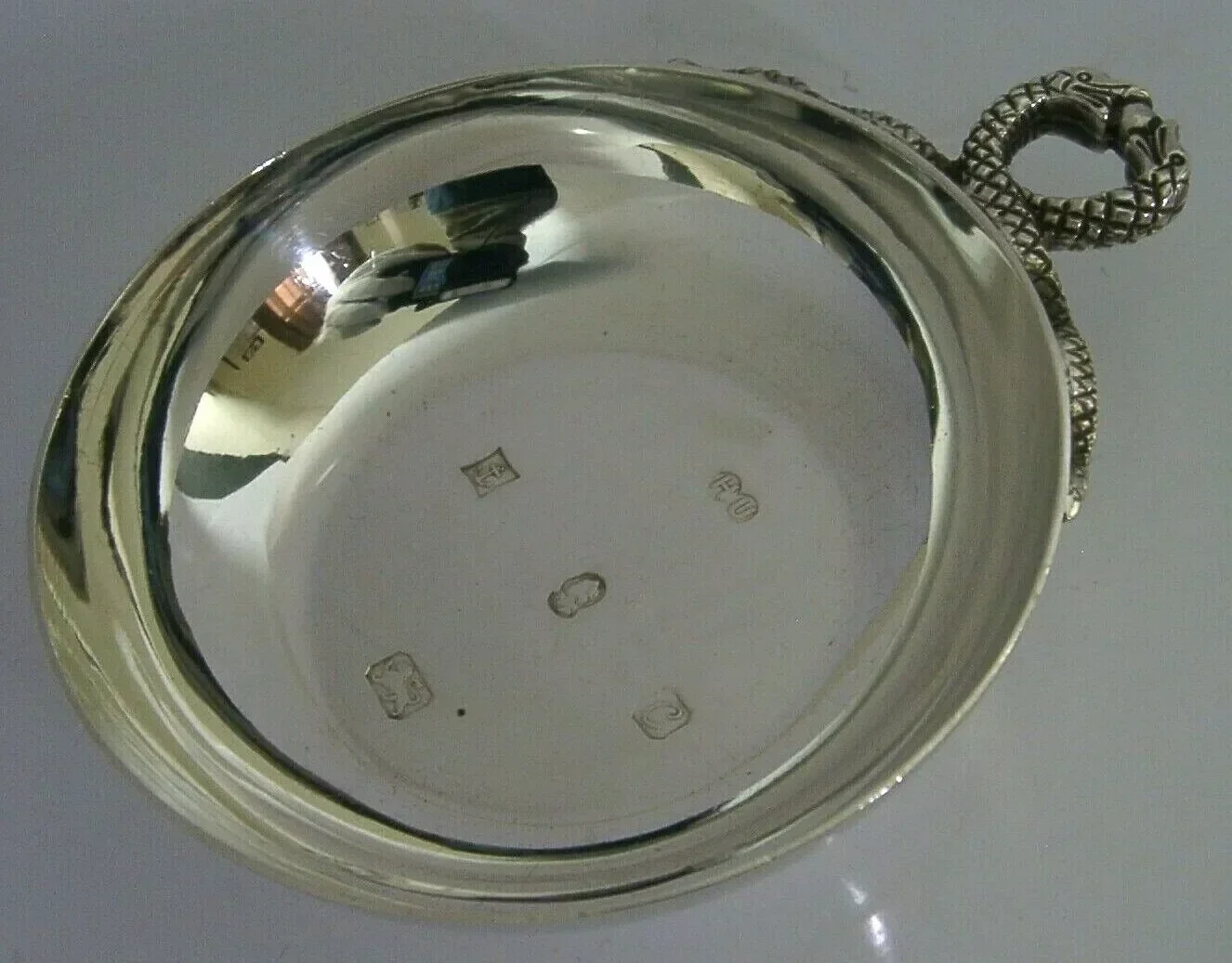A super quality English solid sterling silver wine taster. It is hallmarked for Birmingham 1977 with the makers marks being that of Hampton Utilities. It has been beautifully made having with the handle being cast in the form of two snakes and the bowl has feature hallmarks. It is in superb condition being free from dings splits and repairs. It measures approx. 4.25 inches (10.8cms) across including the handle and 3.5 inches (8.8cms) excluding it by 1 inches (2.6cms) tall and weighs 88 grams. A nice quality example.