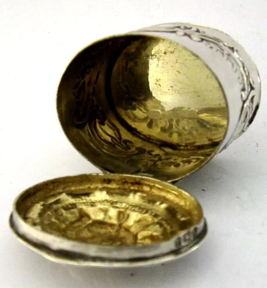 A beautiful Hanau solid sterling silver pill trinket or snuff box. It is hallmarked with Hanau marks along with London import marks for 1899 and the importer being John George Smith. It has been superbly made being decorated with a cherub to the lid and scrolls to the sides. It is in super condition being free from dings splits holes and repairs, the inside is clean and the lid closes tightly. It measures approx. 1.75 inches (4.4cm) across by over 1.25 inches (3.4cm) wide by over 1 inch (3cm) tall and weighs 22 grams. A very pretty piece.