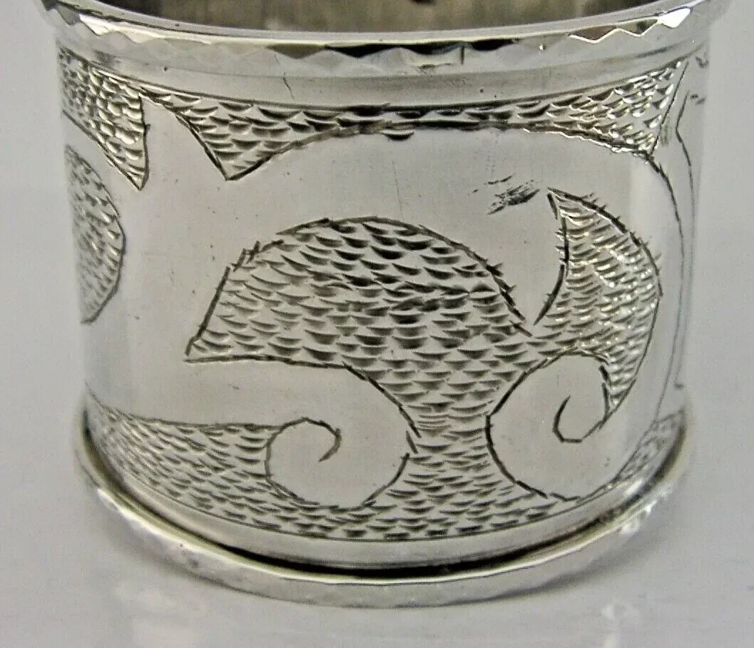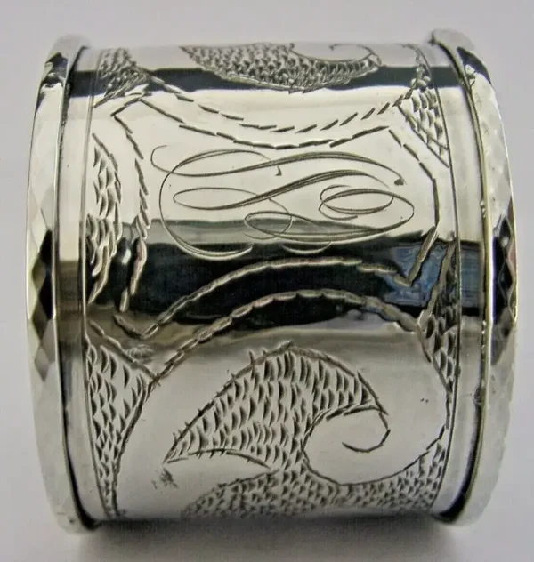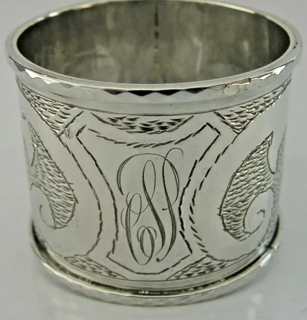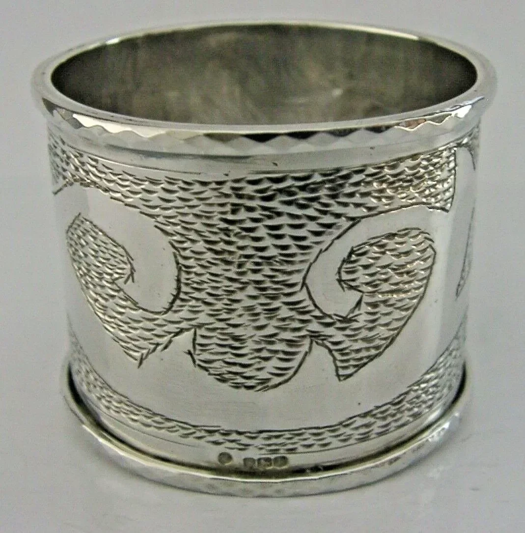 A very stylish English solid sterling silver napkin ring. It is hallmarked for Sheffield 1971 with the makers marks being GP. It has been beautifully made being chased and engraved with a scroll design, the cartouche has been engraved with initials. It is in superb condition being free from dings splits distortions and repairs. It measures approx. 1.5 inches (4cms) tall by 2 inches (5cms) wide and weighs 54 grams. A very nicely designed stylish piece.