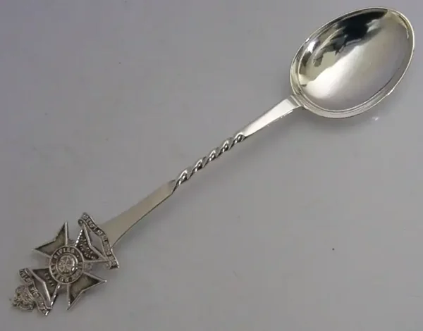 An interesting English antique solid sterling silver spoon. It is hallmarked for Birmingham 1911 with the makers mark being JD. It has been superbly designed with the terminal being in the form of the insignia of the First Surrey Rifles. The reverse has been engraved with an inscription relating to Bisley. It is in super condition being free from dings splits and repairs. It measures approx. 4.75 inches (12cms) long and weighs 13 grams. A nicely made interesting piece.