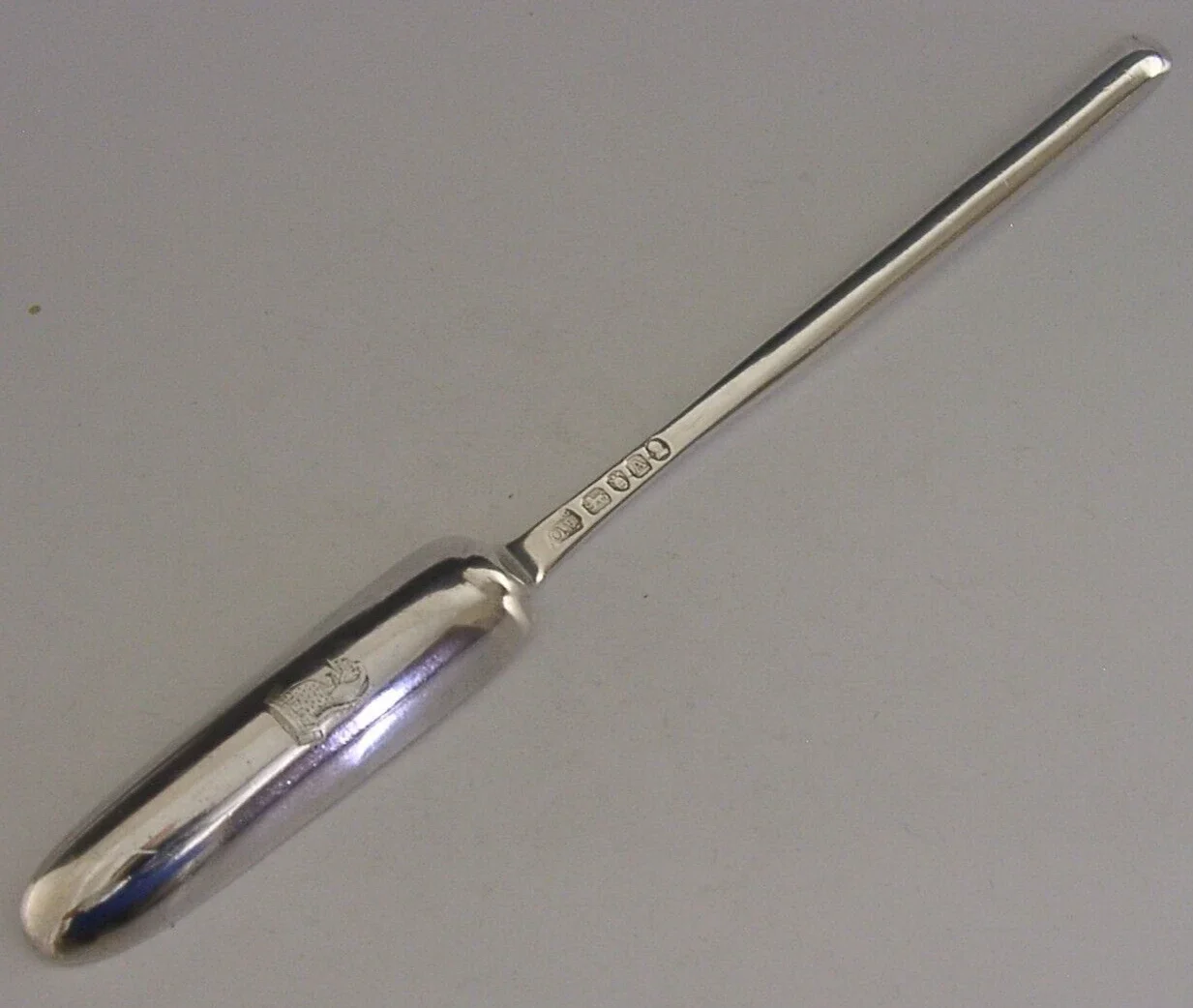 A rare English Georgian antique solid sterling silver marrow scoop. It is hallmarked for London 1796 with the makers mark being that of Thomas Oliphant (or Ollivant) of Manchester. It has been superbly made and has been engraved with a crest used by the Amery family. It is in superb condition having no dings splits repairs or wear. It measures approx. 9 inches (23cm) long by over 0.75 inch (2cm) wide and weighs 40 grams. A well made piece English provincial example.