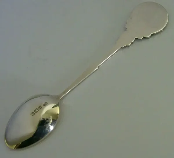 A quality solid sterling silver and enamelled golfing spoon. It is hallmarked for Birmingham 1930 with the maker’s marks being that of Alexander Clark & Co Ltd. It has been well designed having its terminal being hand painted depicting a golfer taking their shot. It is in super condition being free from dings splits and repairs. It measures approx. 4.75 inches (12.2cms) long by 1 inch (2.5cms) wide and weighs 18 grams. A very good quality unusual example.