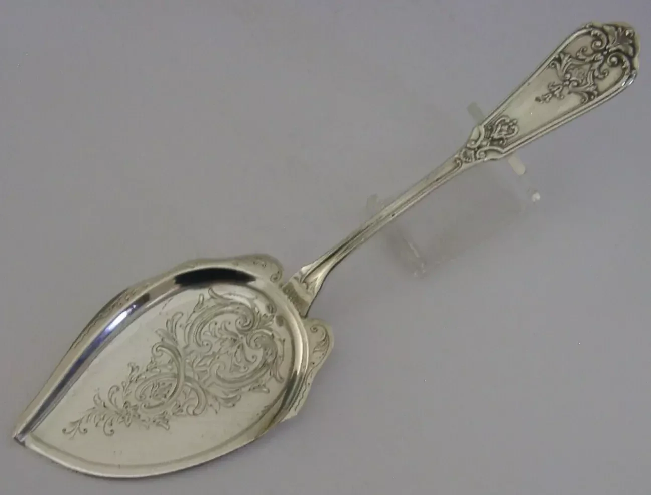 A stunning large heavy German solid silver cake server. It is hallmarked with the 800 silver standard mark and makers/retailers marks and dates to c1900-1910. It has been beautifully made being engraved and is in super condition being free from dings splits distortions and repairs. It measures approx. 9.25 inches (23.7cms) long by almost 2.75 inches (6.7cms) wide and weighs an impressive 98 grams. A very well made piece.