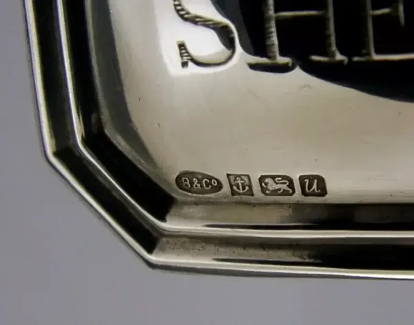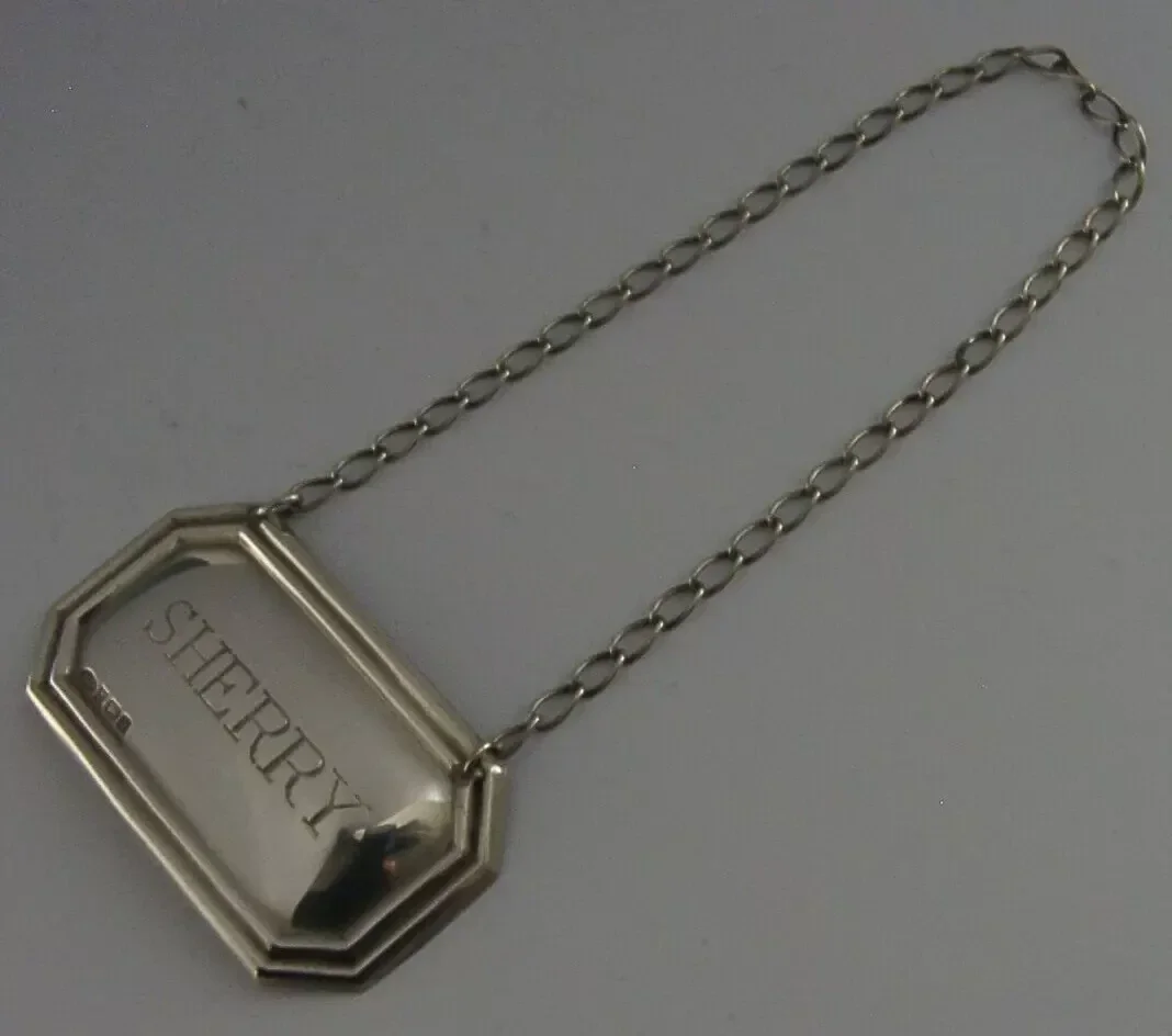 A nice quality English solid sterling silver Sherry decanter / bottle label. It is hallmarked for Birmingham 1994 with the maker’s marks being B&Co. It has been well made and is in super condition being free from dings splits holes and repairs. It measures approx. 2 inches (5cms) across by over 1 inch (3cms) tall excluding the chain and weighs complete with its chain weighs 4 grams. A nicely made example.