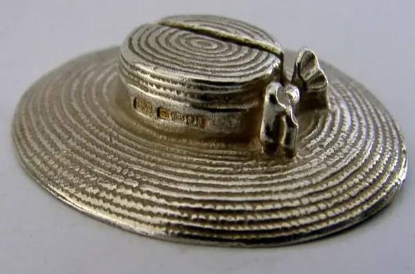 A superbly cast English solid sterling silver novelty menu holder. It is hallmarked for London 2018 with the makers marks being E&J. It has been superbly designed being cast in the form of a straw hat with bow. It is in superb condition being free from dings splits and repairs. It measures approx. 1.5 inch (4cms) by a touch less (3.5cms) wide and weighs 19 grams. A beautiful and unusual example.