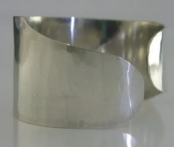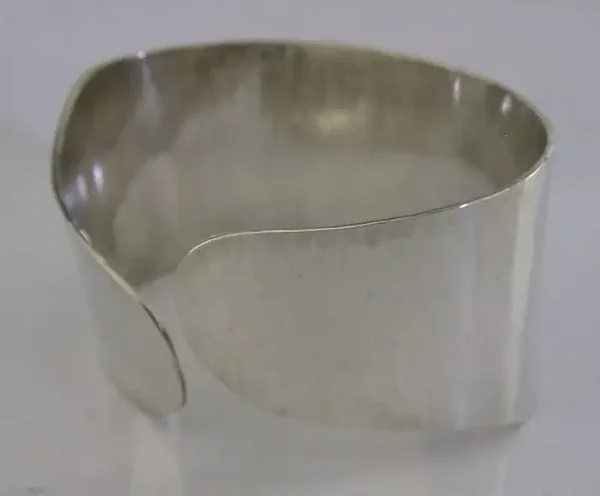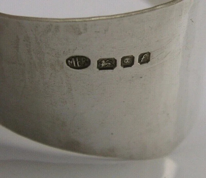 A very unusually English solid sterling silver napkin ring. It is hallmarked for London 1961 with the makers marks being that of Margarette Elizabeth Round. It has been superbly made hand is in super condition being free from dings splits and repairs. It measures approx. almost 2 inches (5cms) across by 1 inch (2.8cms) wide and weighs 22 grams. A very well designed unusual example.
