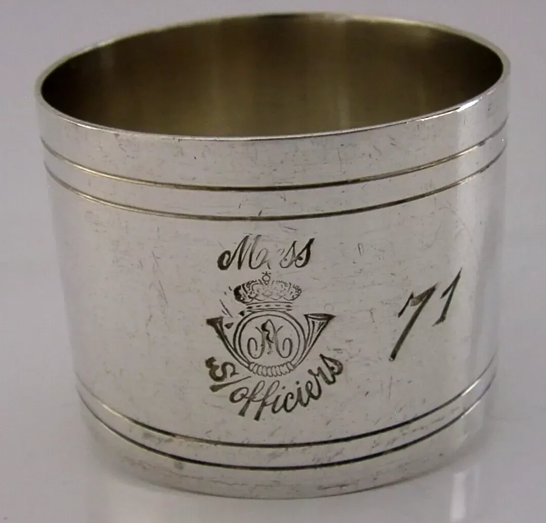A rare French antique silver plated military napkin ring. It has been interestingly engraved 'Mess S/Officers' seating position '71'. I would date it to c1900-1910. It is in good condition being free from dings splits holes and repairs. It measures approx. 1.5 inches (4cm) tall by 2 inches (5.2cm) across and weighs 50 grams. A very interesting example.