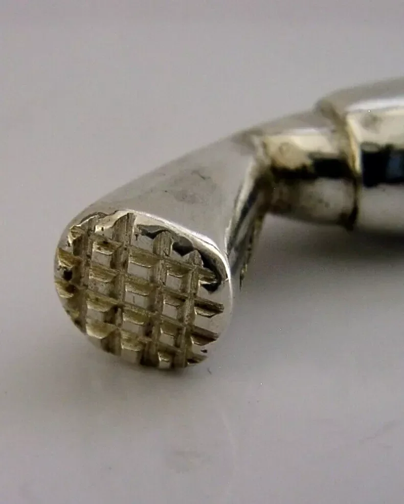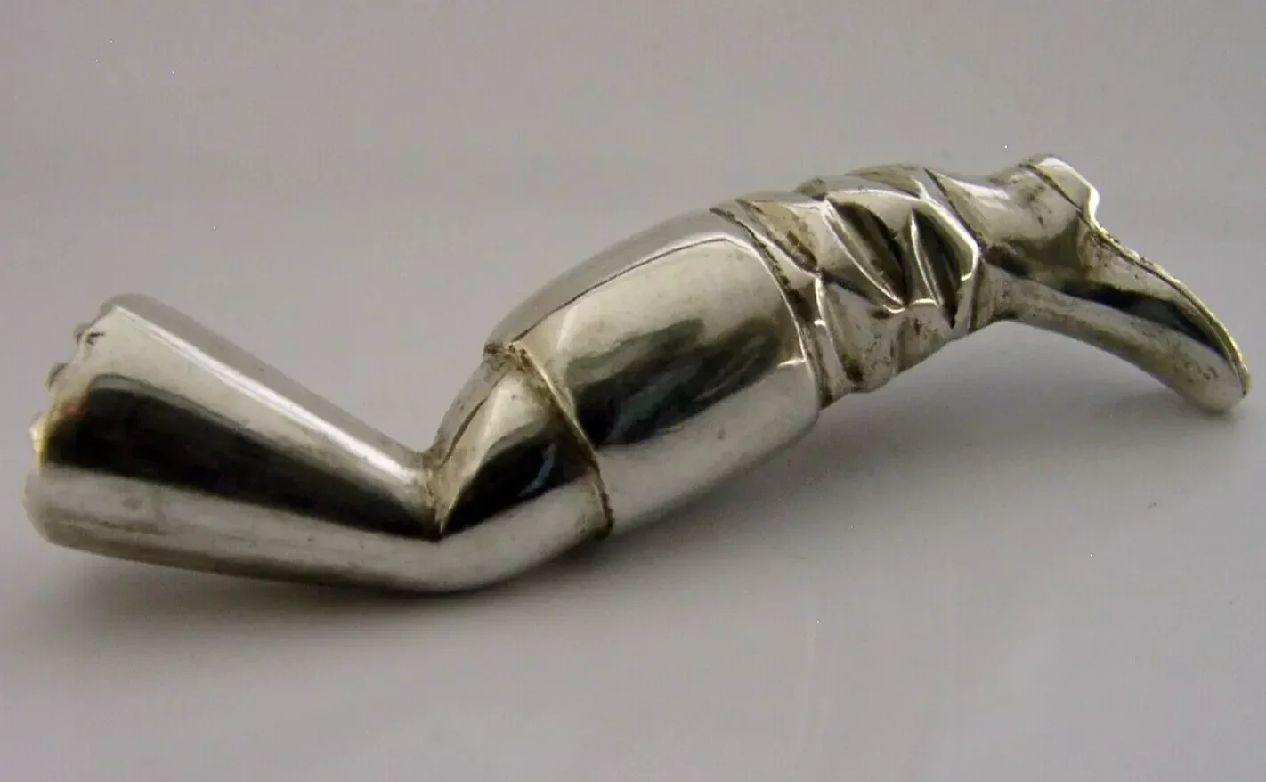 A superb English novelty solid sterling pipe tamper. It is hallmarked for London 1981 with the makers mark being CAP. It has been superbly designed being in the form of a leg, almost certainly a copy of a Georgian example. . It is in super condition being free from dings splits holes and repairs. It measures approx. 2 inches (5.2cm) long by 0.25 inch (1.2cm) wide and weighs 26 grams. A well made example.