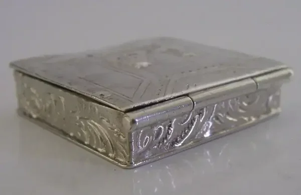 A very pretty German Hanau antique solid sterling silver snuff or pill box. It is hallmarked with import markers for London 1902 with the importers mark being that of Barr, Moering & Co. It has been superbly designed being embossed with two cherubs. It is in super condition being free from dings splits holes and repairs, the inside is clean and gilded. It measures approx. 1.5 inches (3.7cm) across by over 1.25 inches (3.4cm) front to back by 0.25 inch (0.8cm) tall and weighs 26 grams. A very pretty example.