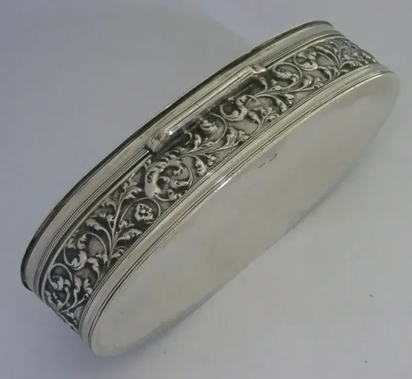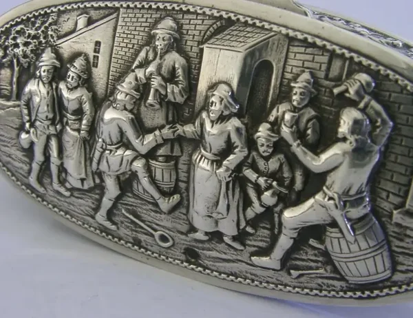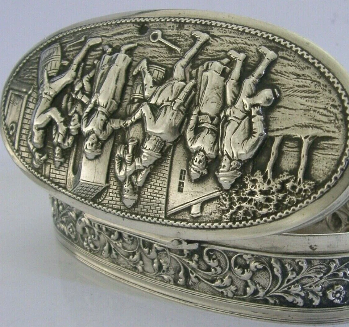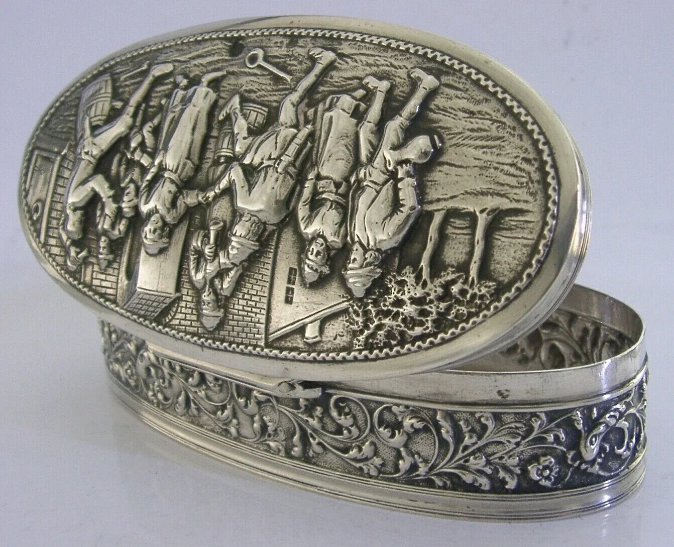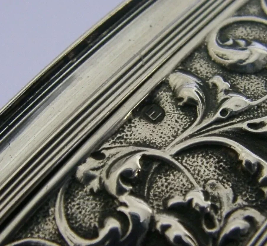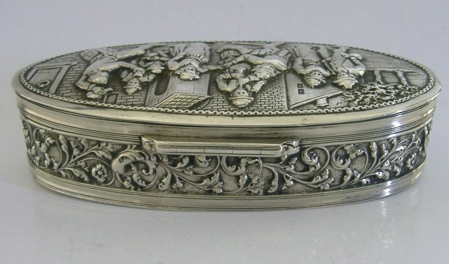 A beautiful rare large Dutch solid silver table trinket or desk box. It is hallmarked with the Dutch lion passant mark for 833 standard silver, a makers mark AS and the date letter E for 1914. It has been beautifully made with the lid being embossed with a street scene. It is in super condition being free from dings splits holes and repairs. The inside is perfectly clean and the lid closes tightly. It measures approx. 5.75 inches (14.6cms) long by 3 inches (7.6cms) wide by 1.5 inches (3.7cms) tall and weighs 162 grams. A beautifully made rare high quality piece.