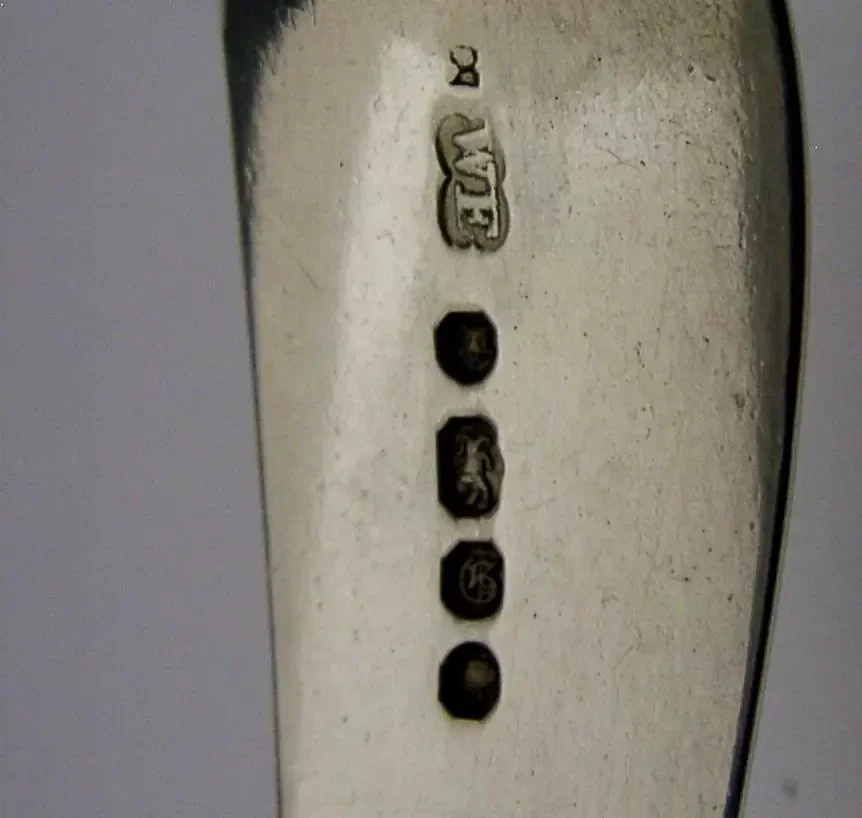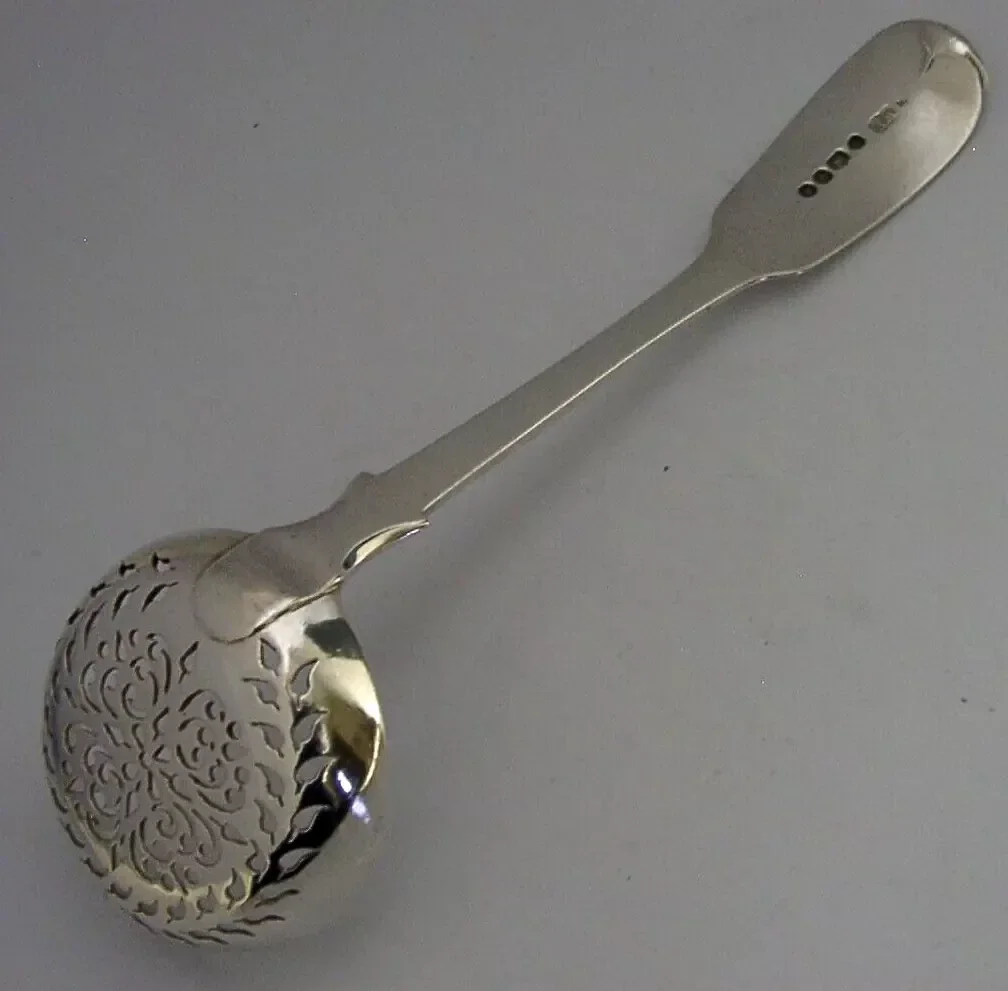 A superb Victorian English antique solid sterling silver sugar sifter spoon. It is hallmarked for London 1842 with the makers marks being William Eaton. It has been superb designed with the terminal being engraved with the crest used by the Waterford family. It is in superb condition being free from dings splits and repairs. It measures approx. 6.25 inches (15.7cm) long by almost 2 inches (4.8cm) wide and weighs 48 grams. A very interesting piece.
