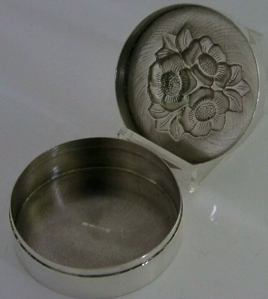 A super quality English solid sterling silver box. It is hallmarked for Sheffield 2004 with the makers marks being MH. It has been beautifully designed having an embossed lid decorated with flowers. It is in super condition being free from dings splits holes and repairs, clean inside. It closes tightly. It measures over 2 inches (5.2cms) by 0.75 inches (1.8cms) tall and weighs 38 grams. A high quality nice clean piece.