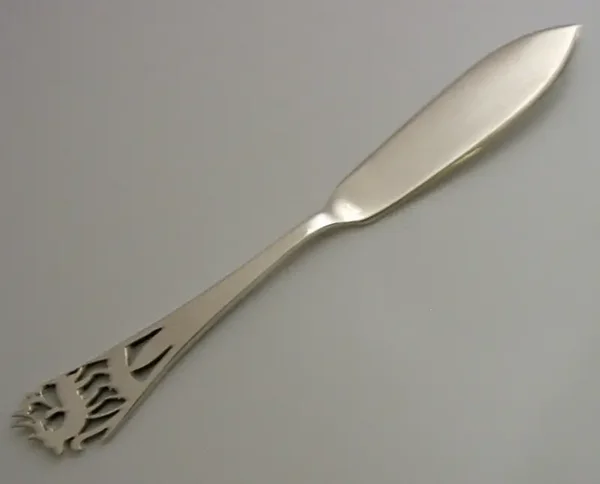 A beautiful Scottish solid sterling silver butter spreader. It is hallmarked for Glasgow 1946 with the maker being John D McAllister. It has been superbly designed with the terminal being pierced in the form of a stag. It is in super condition being free from dings splits and repairs, initialled to the handle. It measures approx. 4.75 inches (12cm) long by 0.5 inch (1.4cm) wide and weighs 14 grams. A beautifully made example.