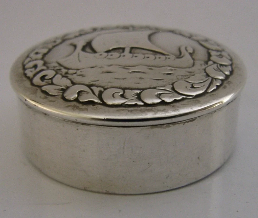 BEAUTIFUL NORWEGIAN SOLID SILVER VIKING BOAT SHIP PILL BOX c1940 ANTIQUE