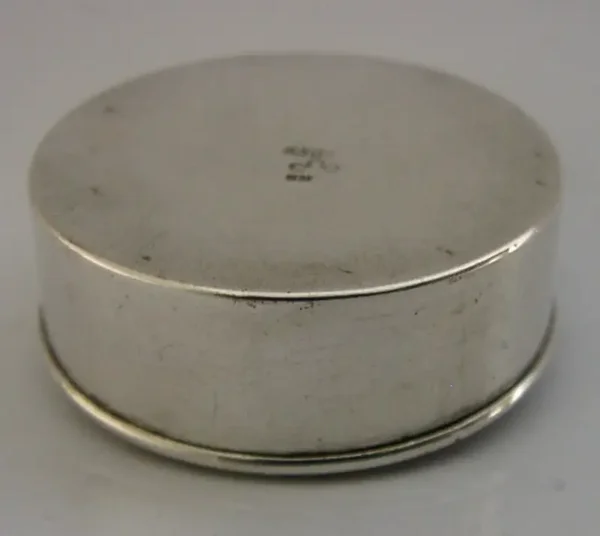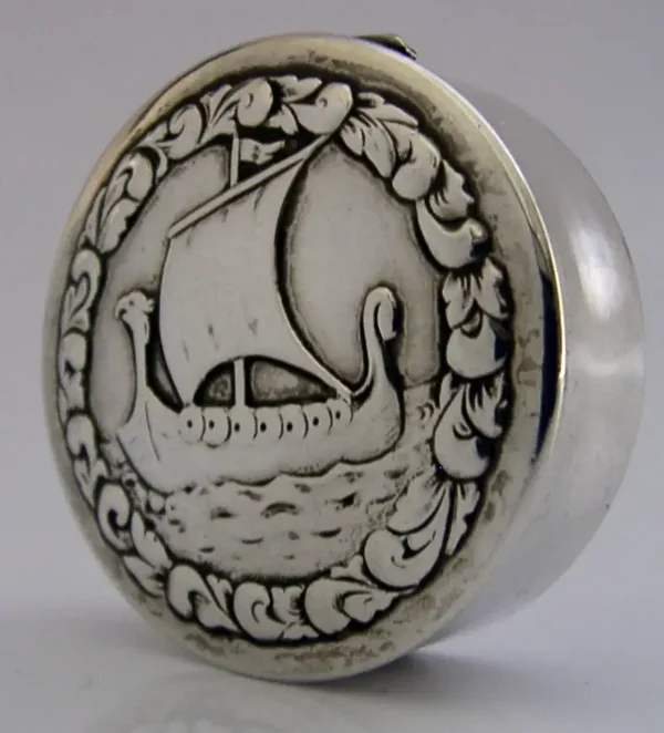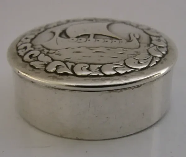 A beautifully Norwegian solid silver box. It is hallmarked with the Norwegian 830 standard mark along with a makers mark. I would ate it to c1940. It has superbly designed with the lid depicting the image of a Viking ship or boat. It is in superb condition being free from splits, and repairs. It measures approx. 1.5 inches (3.8cm) across by almost 0.75 inch (1.4cm) tall and weighs 12 grams. A beautifully made piece.