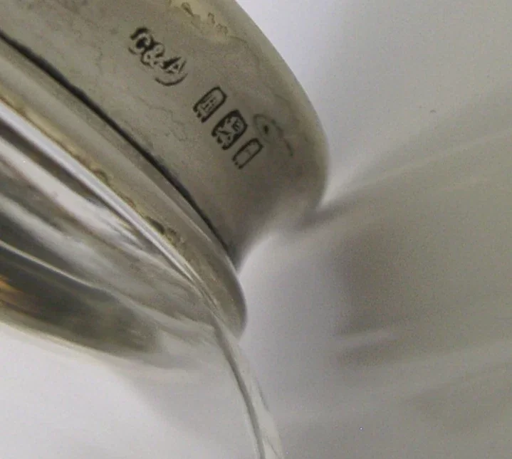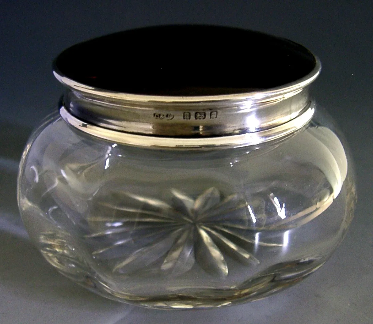 A nice quality English solid sterling silver and cut glass pot. It is hallmarked for Birmingham 1925 with the makers mark being C&A. It has been beautifully made being having a faux tortoiseshell and silver lid. It is in super condition. The silver is free from dings splits repairs and dings. The glass is free from cracks chips and repairs. It measures approx. 3.25 inches (8cm) wide by 2.5 inches (5.5cm) tall and weighs 100 grams. A beautifully made piece.
