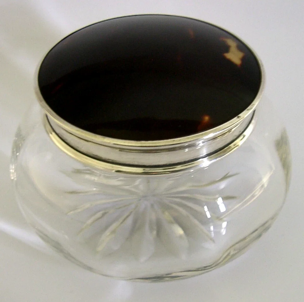 STERLING SILVER CUT GLASS FAUX TORTOISESHELL POT JAR 1925 ART DECO