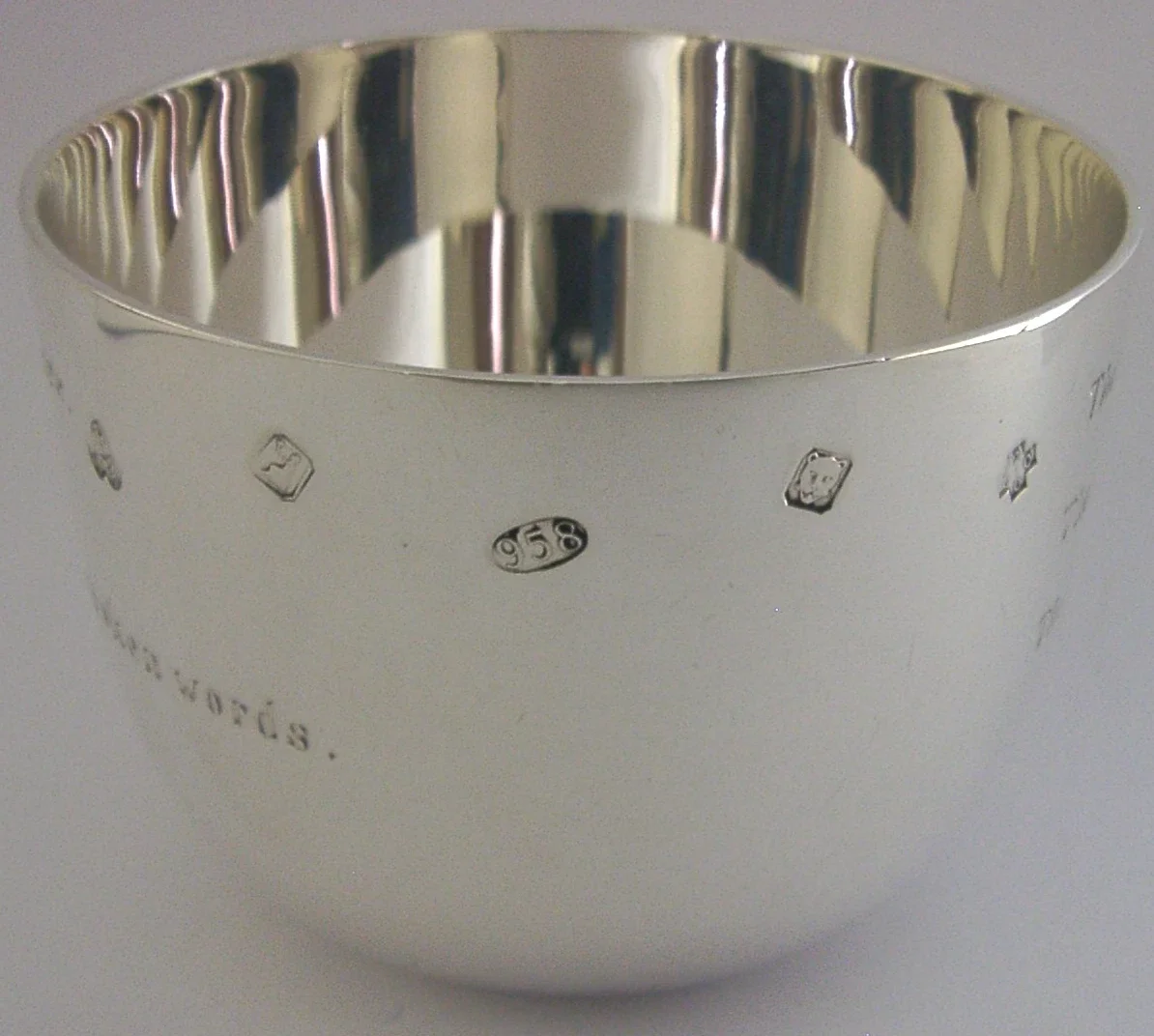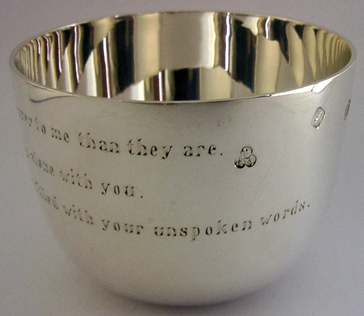 A very stylish heavy English solid Britannia silver tumbler cup. It is hallmarked for London 2000 with the maker being William Hawkes & Son. It is been superbly designed having a round base, a copy of an earlier Georgian example designed not to tip on an uneven table top. It has been engraved with an inscription 'Those who are near to me do not know that you are nearer to me than they are. Those who walk with me do not know that I am walking alone with you. Those who speak to me do not know that my heart is filled with your unspoken words' by Rabindranath Tagore.It is in superb condition being free from dings splits holes and repairs. It measures approx. 3.75 inches (9.4cm) across by almost 2.75 inches (6.8cm) tall and weighs 232 grams. A superbly designed piece.