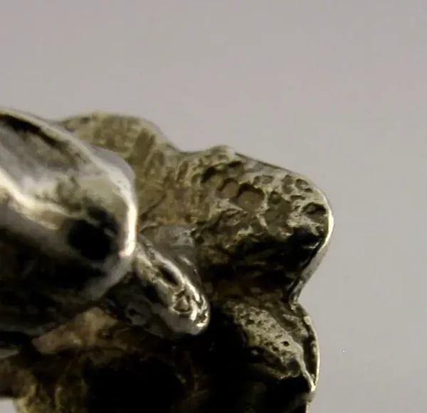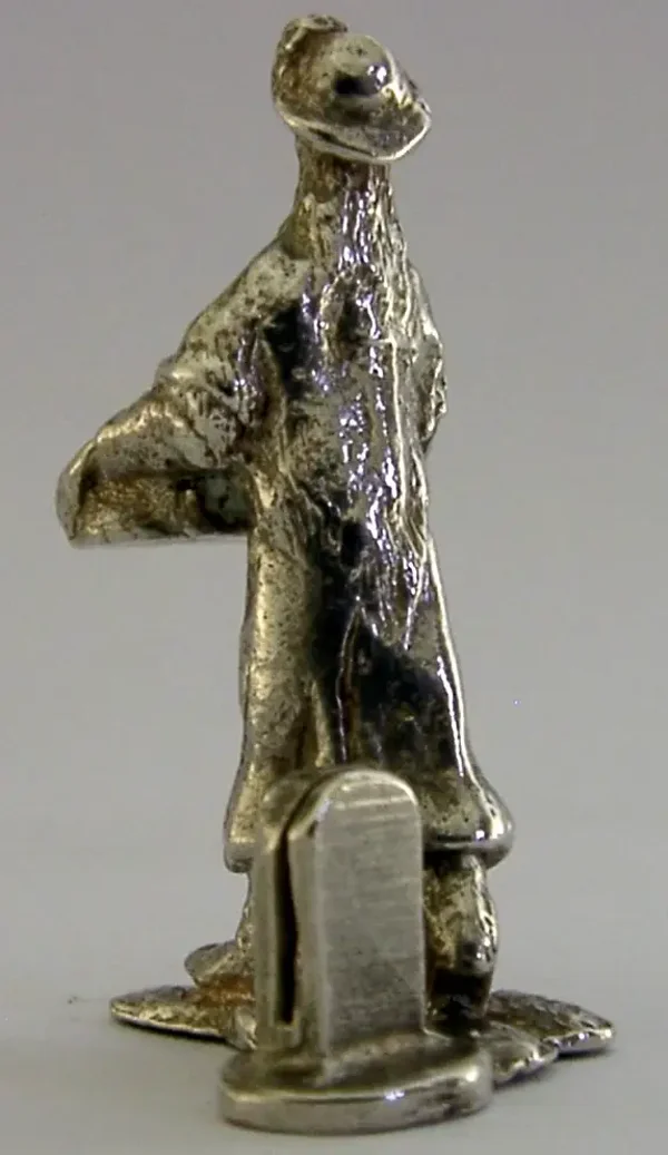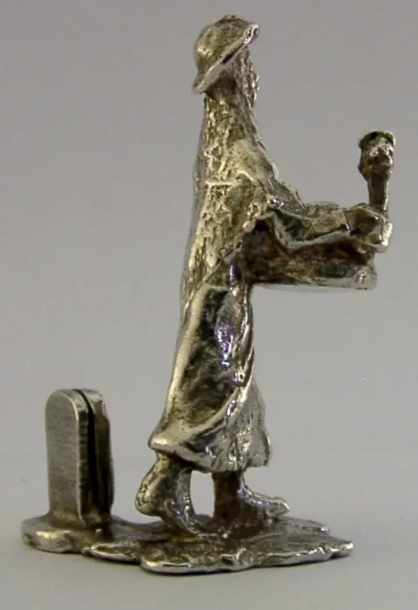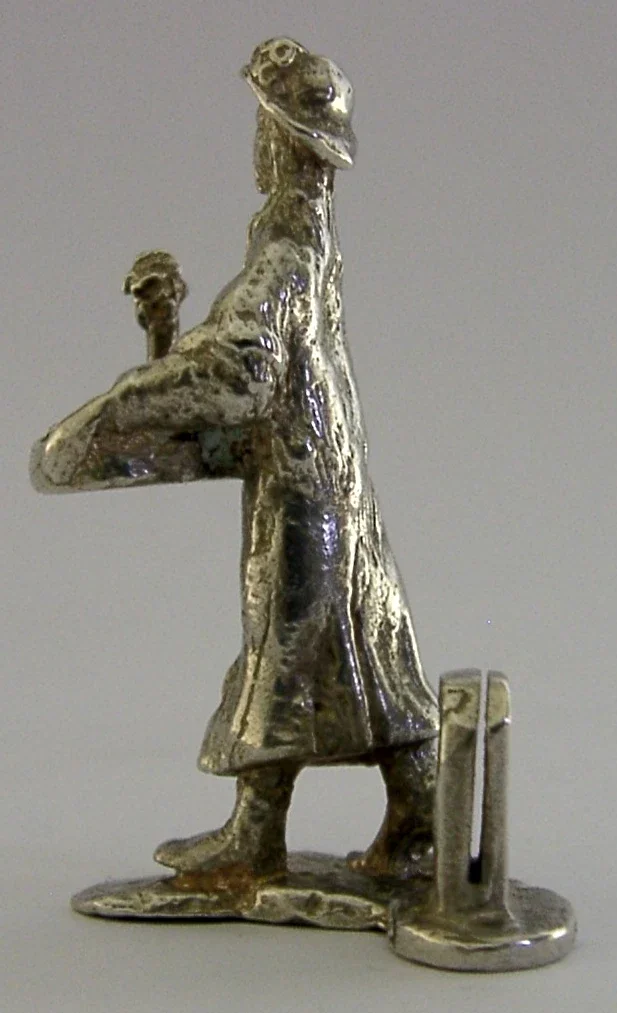 A solid cast English solid sterling silver place card or menu holder. It is hallmarked for London 1972 with the maker being that of Thomas Charles Jarvis. It has been superbly designed being cast in the form of an Victorian posy / flower seller with the milestone numbered 9, this holds the place card. There was a set produced by TC Jarvis - all Victorian street characters. It is in superb condition being free from dings splits and repairs. It measures approx. 2 inches (5.1cm) tall by 1.25 inches (3.2cm) across the base and weighs 38 grams. An interesting well made piece.