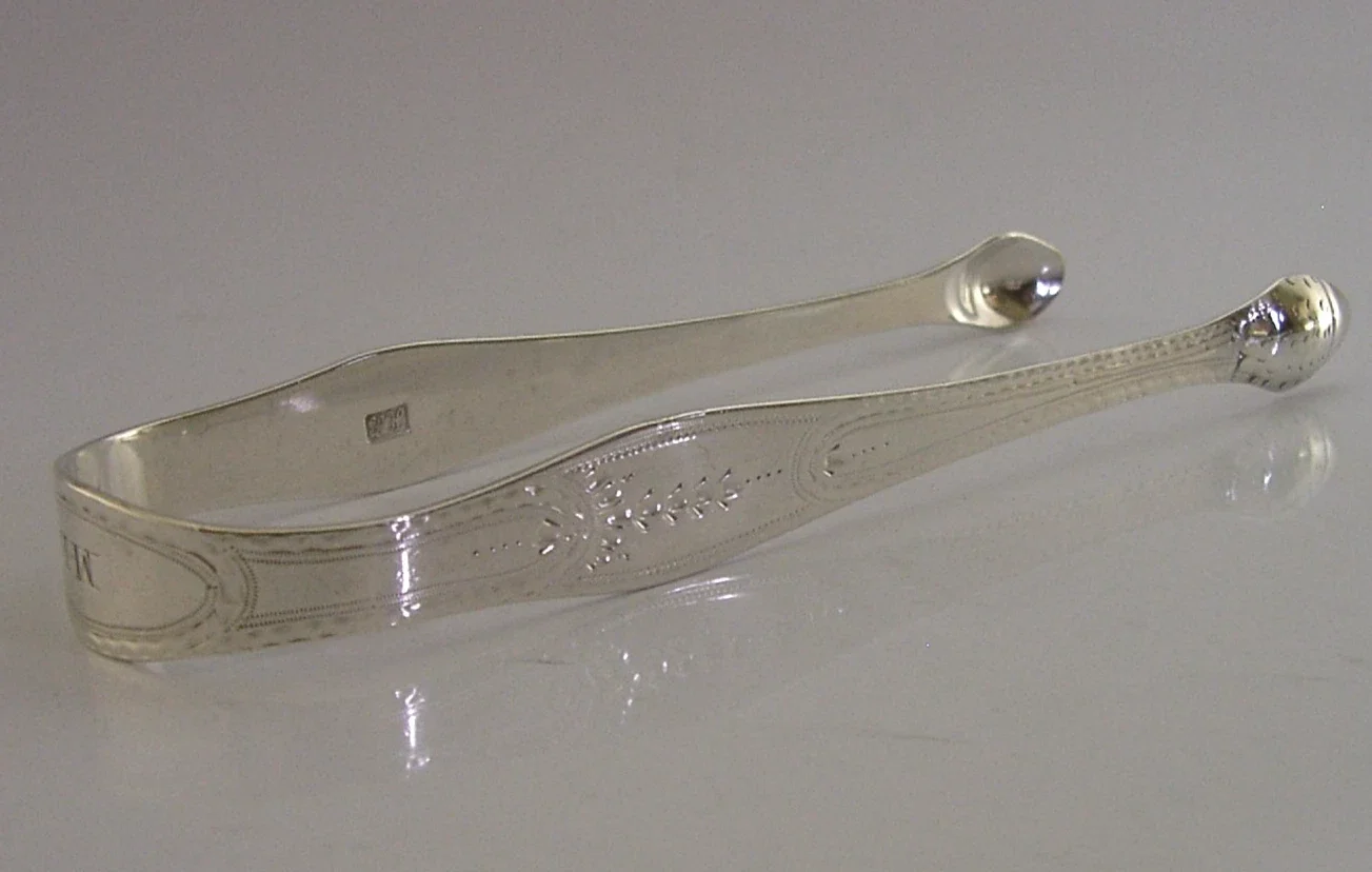Beautiful unusual English Georgian antique solid sterling silver sugar tongs. They are hallmarked with the Lion Passant mark, King George mark and the makers mark of Hester Bateman. They date to c1780s. They have been beautifully designed being bright cut with acorn grips and engraved to the arch with the initials MB. They are in superb condition being free from dings splits and repairs. They measure approx. 5.5 inches (14cm) long and weigh 30 grams. Superb examples.