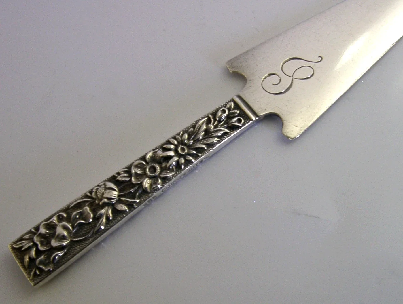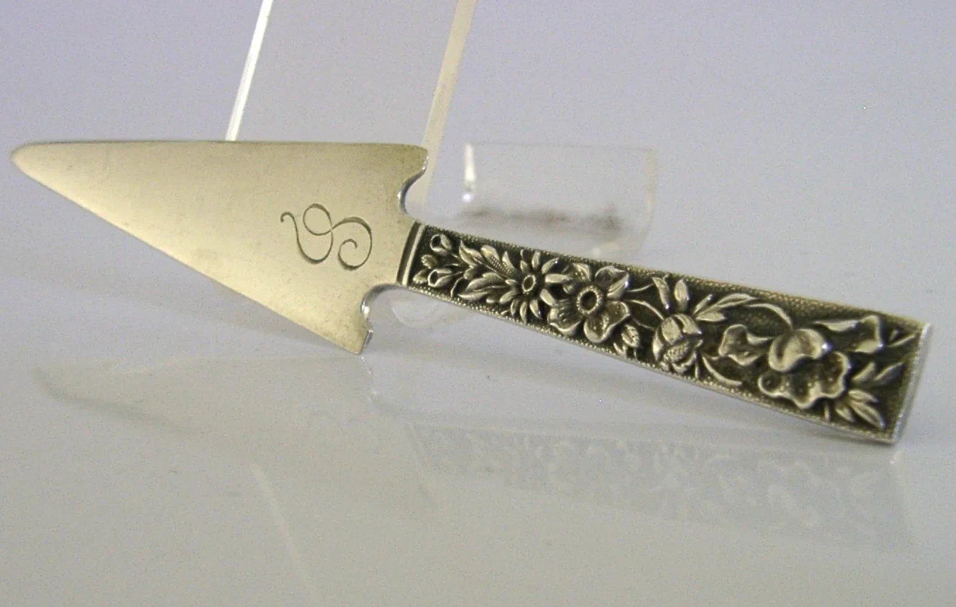 A beautiful American solid sterling silver envelope letter opener. It is hallmarked with the 925 standard mark along with the maker being S Kirk & Son. It dates to c1900. It has been superbly designed in the form of a large arrow head and is in super condition having no dings splits distortions or repairs, it has been engraved with an initial. It measures over 5 inches (13cm) long by over 0.75 inch (2.3cm) wide and weighs 26 grams. A very high quality piece.