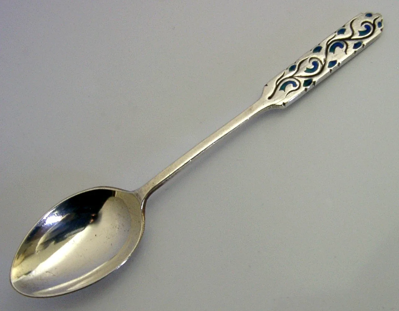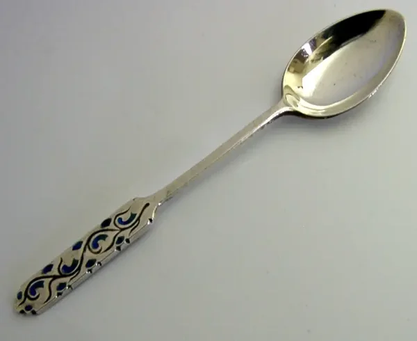 A beautiful solid sterling silver Arts and Crafts spoon. It is hallmarked for Birmingham 1926 with the maker being that of Liberty & Co of London. It has been beautifully designed having a Art Nouveau / Arts and Crafts terminal and are in super condition being free from dings splits and repairs. It measures over 4.25 inches (11.2cm) long over 0.75 (2.2cm) wide and weighs 12 grams. A beautifully designed piece.