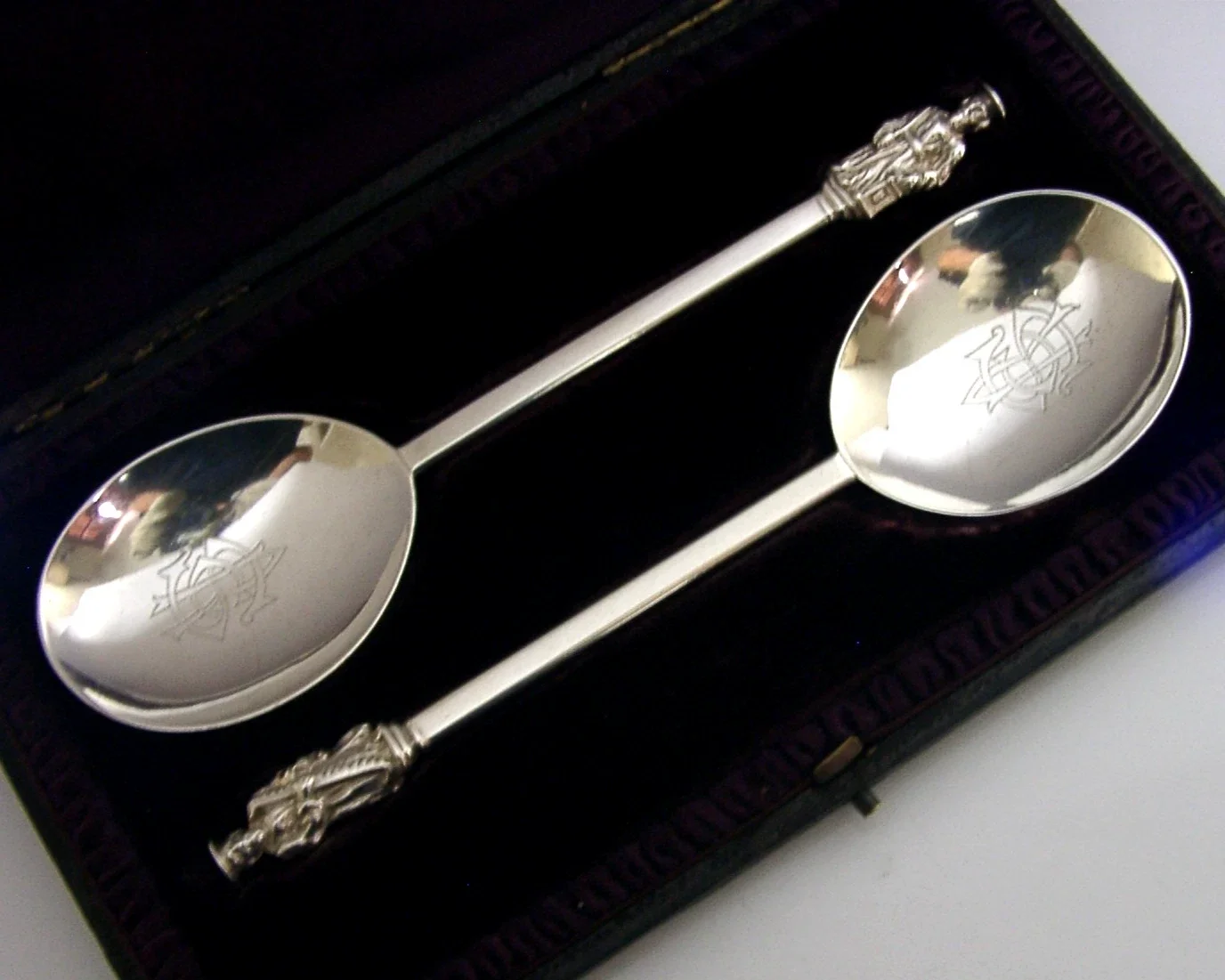 A super quality cased set of English Victorian antique solid sterling silver serving spoons. They are hallmarked for London 1888 with the maker being Hukin & Heath (John Thomas Heath & John Hartshorne Middleton). They have been beautifully made with the terminals being in the form of apostles and the bowls engraved with entwined initials CRS CSR etc.... They are in superb condition being free from dings splits and repairs, the case is equally superb with just a few scuffs. They measure approx. 6.5 inches (16.6cm) long by over 1.75 inches (4.7cm) wide and have a combined weight of 86 grams excluding the case. A super quality set.