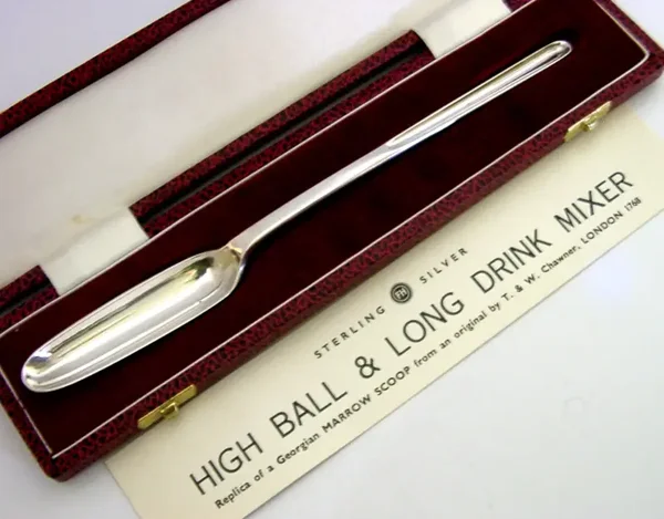 A superb cased English solid sterling silver high ball cocktail mixer / maker. It is hallmarked for Sheffield 1978 with the maker being that of Francis Howard Ltd. It is in superb condition being free from dings splits distortions and repairs. The case likewise is superb. It measures approx. 8.5 inches (21.7cm) long by over 0.75 inch (2.2cm) wide and weighs 48 grams excluding the case. A superb piece.