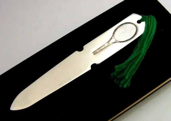A nice quality cased English solid sterling silver novelty letter opener. It is hallmarked for Birmingham 1998 with the maker being LBLd. It has been superbly designed depicting a tennis racket. It is in superb condition being free from dings splits and repairs. It measures approx. 4.5 inches (11.4cm) long by 0.75 inch (1.9cm) wide and weighs 20 grams excluding the case. A more unusual nice clean example.