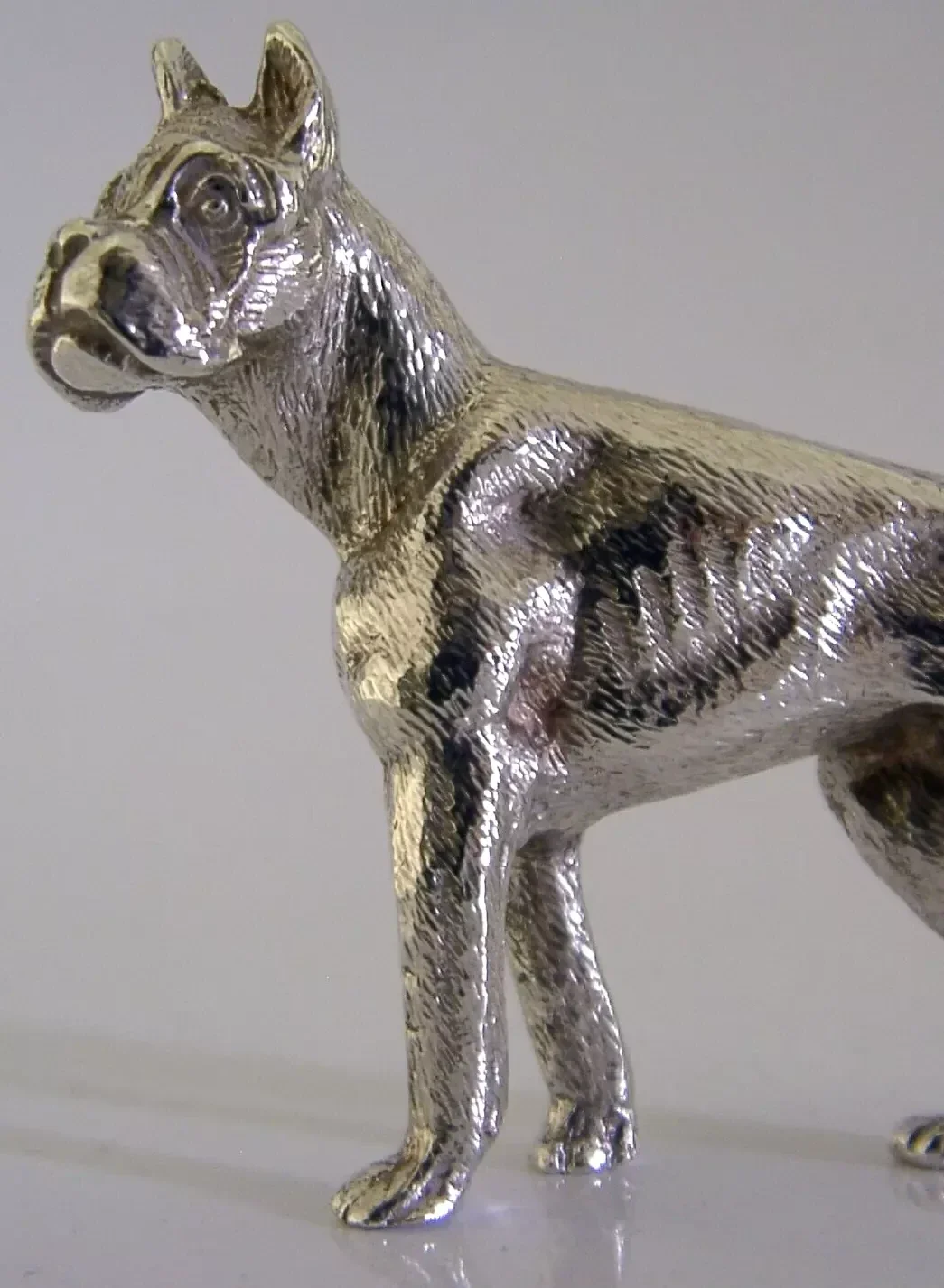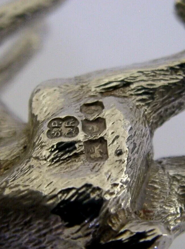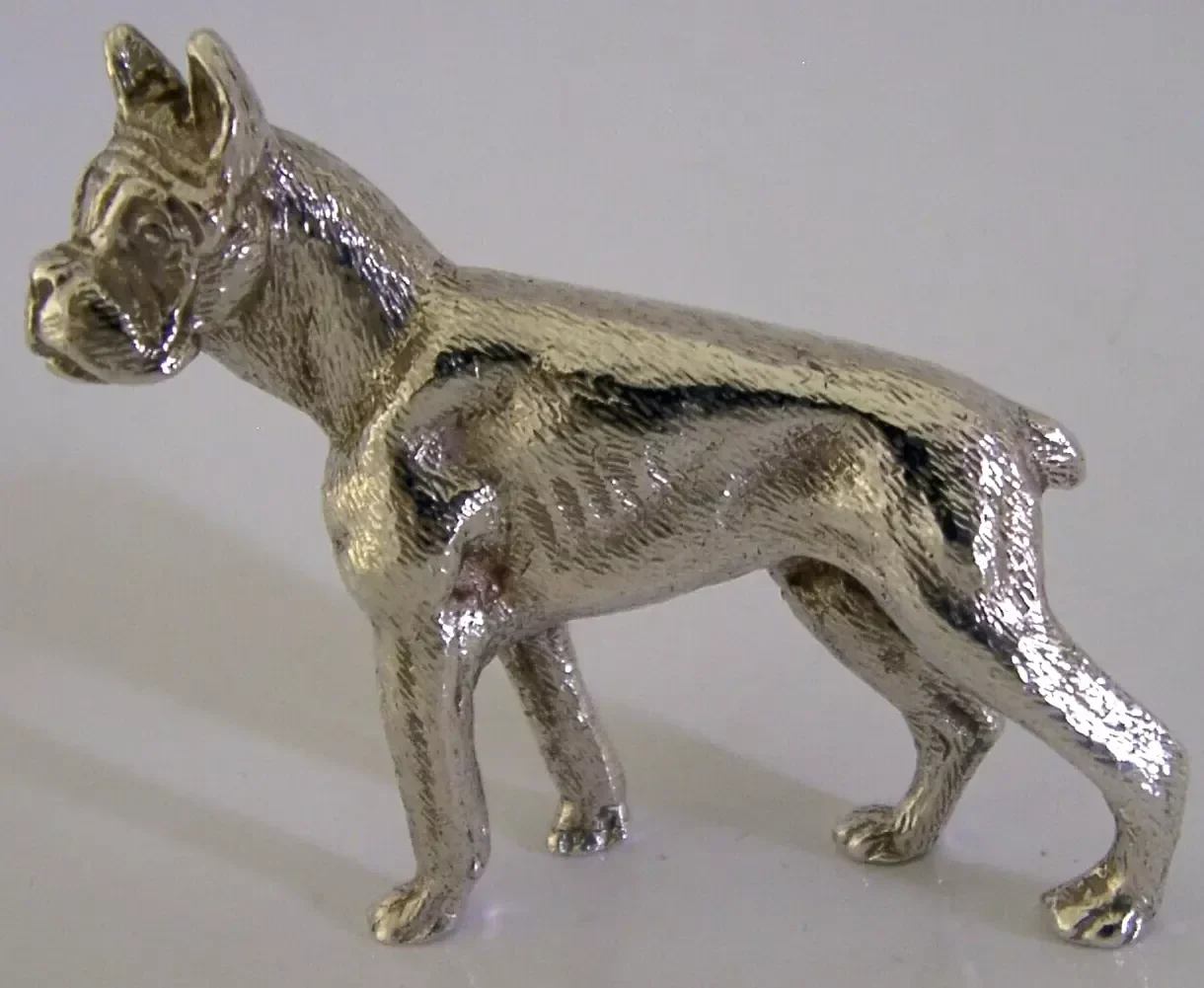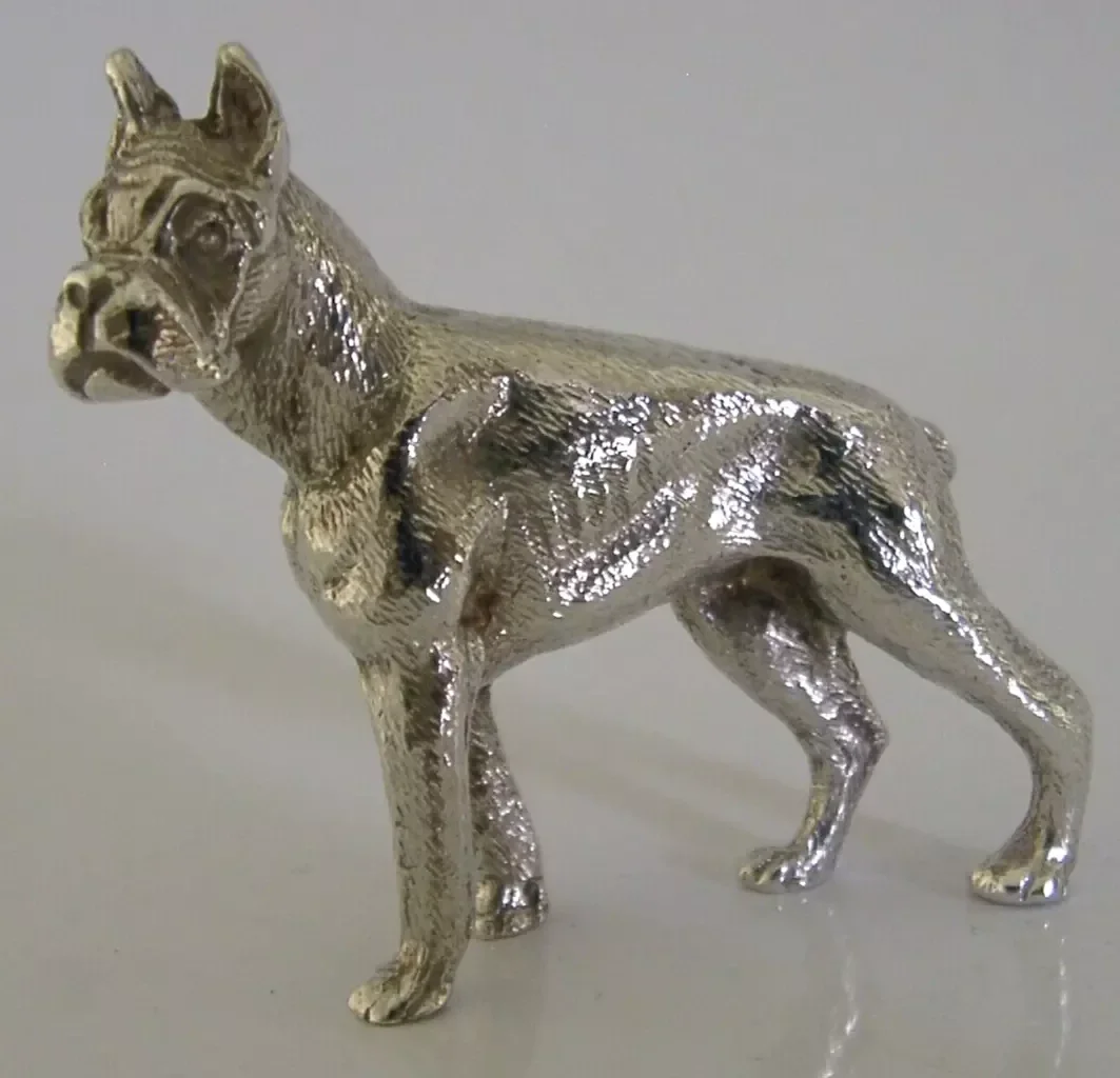 A superbly modelled decent sized solid sterling silver animal figure. It is hallmarked for London 1971 with the maker being SP over QR. Its been beautifully modelled being finely cast in the form of a Boxer dog. It is in super condition being free from dings splits and repairs. It measures approx. 2 inches (5.3cm) long by 2 inches tall and weighs 80 grams. A very well designed high quality example.