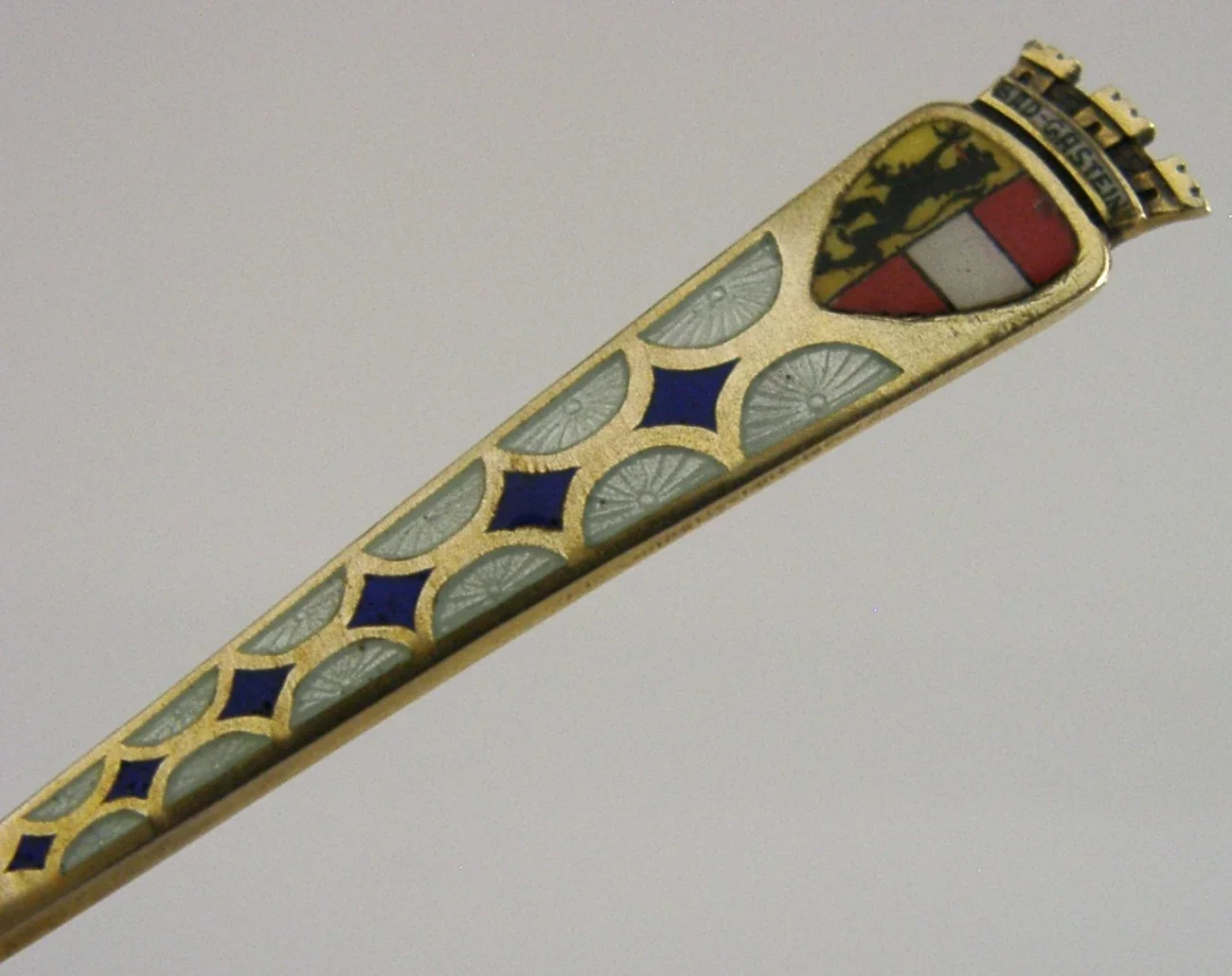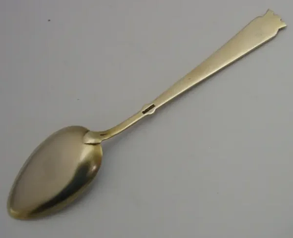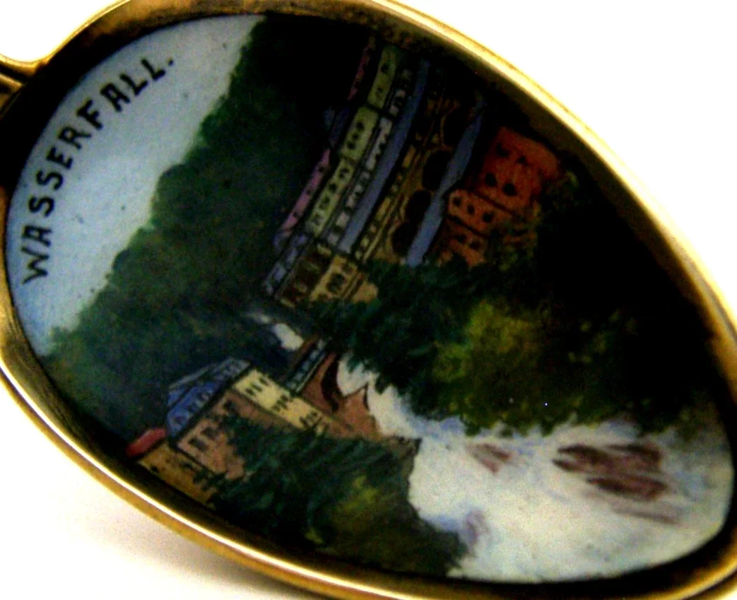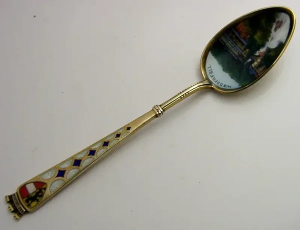 A beautiful Austrian solid silver gilt and enamel souvenir spoon. It is hallmarked with the 800 silver standard mark and makers mark KEK. I would date it to 1920s. It has been made as a souvenir of the waterfall at Bad Gastein. It is in perfect condition being free from dings splits distortions and repairs. The enamel is complete and free from chips cracks and repairs. It measures approx. 4.75 inches (11.7cms) long and weighs 13 grams. A nicely designed unusual example.