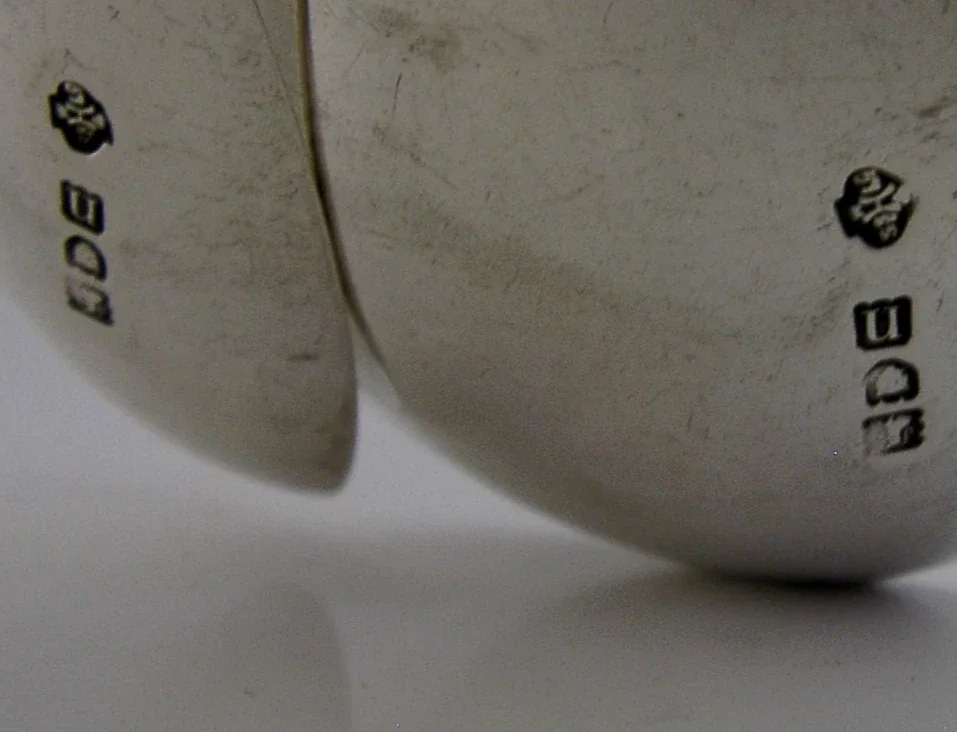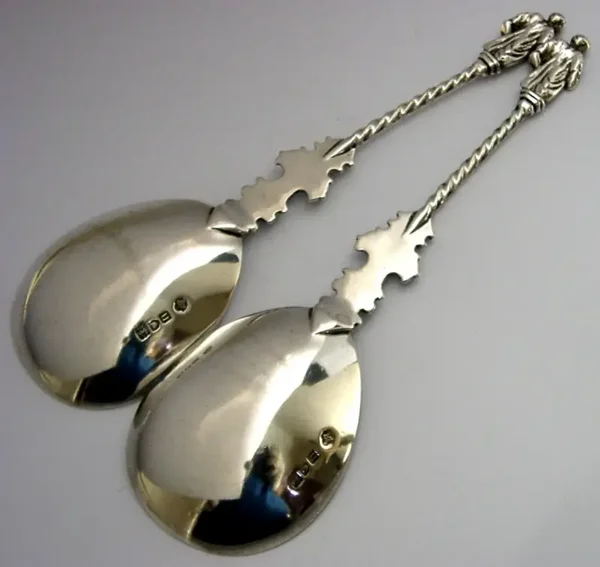 A beautiful pair of English Edwardian antique solid sterling silver apostle serving spoons. They are hallmarked for London 1908 with the makers marks being William Hutton. They have been beautifully made and are in superb condition being free from dings, splits and repairs. They measure approx. 7 inches (17.8cm) long by 2 inches (5cms) wide and combined weigh 91 grams. A very good quality Edwardian set.