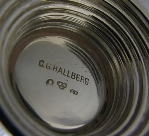 A very interesting Art Deco solid silver tennis cup. It is hallmarked with the Swedish silver marks along with the date code for 1902. It has been nicely designed having enamel detailing to its front and a band of tennis racquets. It is in superb condition being free from dings splits and repairs, the odd faint mark. It measures approx. 3.25 inches (8.3cms) tall by 1.75 inches (4.3cms) across the rim and weighs 43 grams. A beautiful piece.