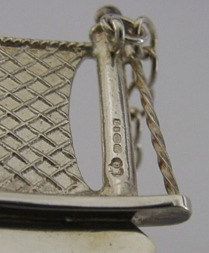 A very nice quality mint English solid sterling silver decanter or bottle wine label. It is hallmarked for London 2003 with the makers mark being PLG. It has been superbly designed being cast in the form of a tennis net. It is in super condition being free from dings splits holes and repairs. It measures approx. 2 inches (5cm) wide by 1.5 inches (4cm) excluding the chain and weighs 22 grams, excluding the box and felt bag. A nice quality well made piece.