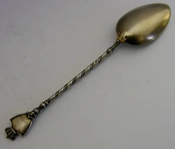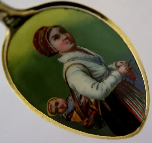 A beautiful Swedish solid silver gilt and enamel souvenir spoon. It is hallmarked with the National three crown mark and dates to c1910. It has been made as a souvenir having the terminal enamelled in the form of the Swedish three crown crest and the bowl depicting a female figure in national costume with a child. It is in perfect condition being free from dings splits distortions and repairs. The enamel is complete and free from chips cracks and repairs. It measures approx. over 4.5 inches (11.5cms) long and weighs 14 grams. A very nicely designed unusual example.