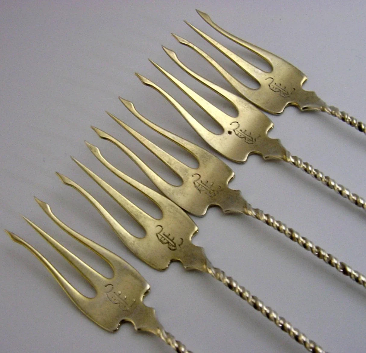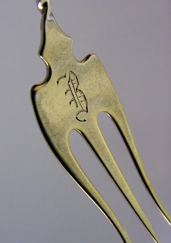 An unusual set of five sterling silver pickle or Hors d'oeuvre forks. The are hallmarked STERLING along with the makers marks of Whiting of the USA. I would date them to c1900. They have a nice trident design, all engraved B, and are in super condition being free from dings splits and repairs. It measures approx. 5.5 inches (14cm) long and combined weigh 46 grams. A nicely designed set.