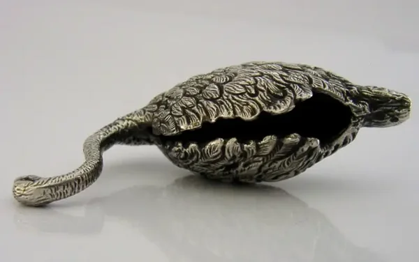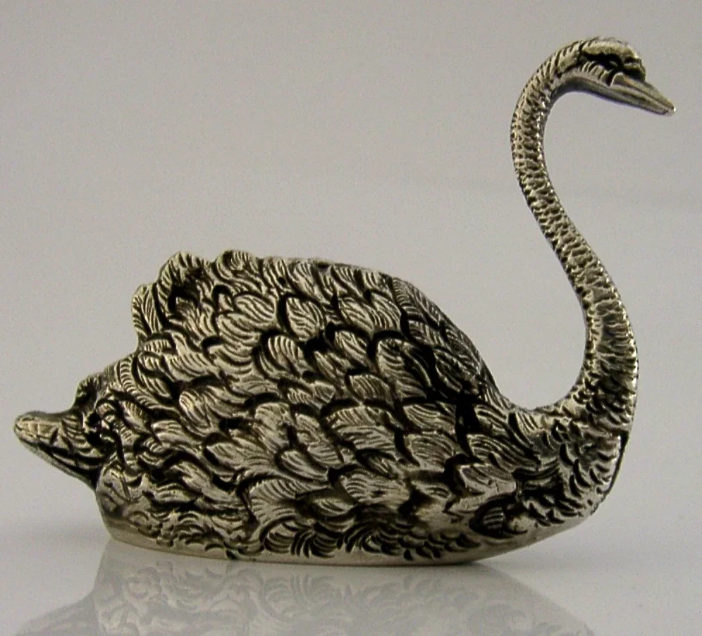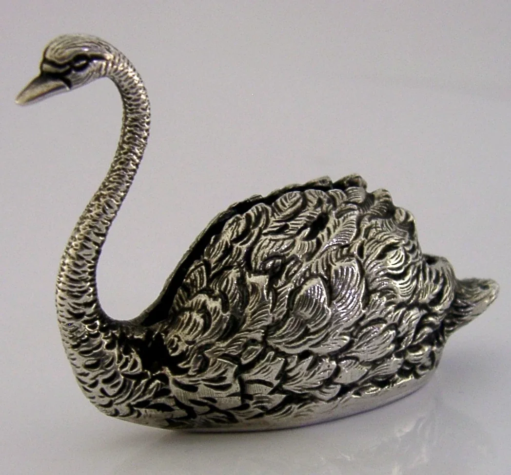 A very unusual English solid sterling novelty swan, possibly a pin cushion. It is hallmarked for Birmingham 1977 with the makers marks being EAW. It has been beautifully cast and is in superb condition being free from dings splits holes and repairs, if used as a pin cushion a cushion will need to be inserted. It measures approx. 2.5 inches (6.2cms) long by 2 inches tall and weighs 45 grams. A very good quality piece.