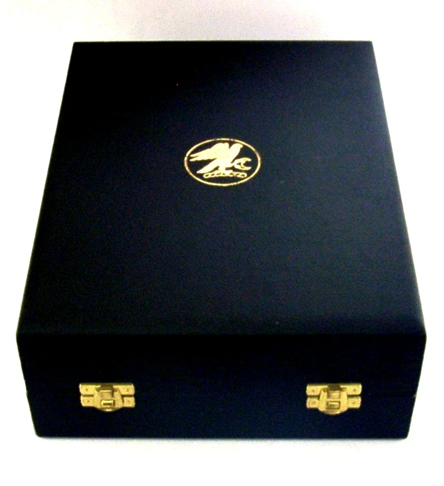 A beautiful very high quality pair of English solid sterling silver wine or champagne goblets. They are hallmarked for London 1979 with the makers being SD for Stuart Devlin. The also have a small falcon mark, the box is marked Senior Falcon Award and limited edition numbers to their bases 209 and 243. They have been superbly designed and are in superb condition being free from dings splits distortions and repairs. The case is also superb. They measures approx. 8.75 inches (22.5cm) tall by a touch under 3 inches across the rims and combined weigh 408 grams (excluding the box). A top quality well made set.