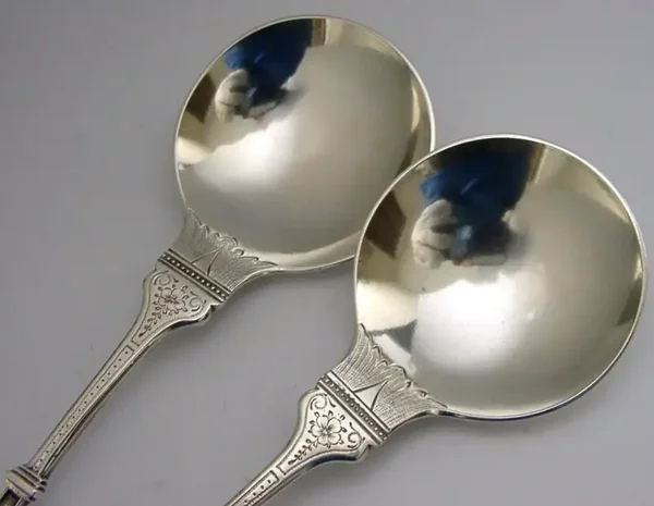A beautiful pair of English Edwardian antique solid sterling silver apostle serving spoons. They are hallmarked for London 1902 with the makers marks being that of Holland, Aldwinckle & Slater. They have been beautifully made and are in superb condition being free from dings, splits and repairs. They measure approx. 7.25 inches (18.5cm) long by 2.25 inches (5.6cms) wide and combined weigh 96 grams. A very good quality Edwardian set.