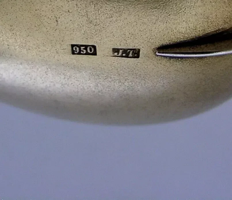A superb rare solid sterling silver gilt caddy spoon. It is hallmarked 950 along with the makers marks of Tostrup of Norway. I would date it to c1900. It has been superbly designed having a plique a jour handle and being completely gilded. It is in super condition being free from dings splits distortions and repairs. The plique a jour work is complete. It measures approx. 3 inches (7.8cms) long by 2.25 inches (5.5cms) tall and weighs 22 grams. A beautifully made example.